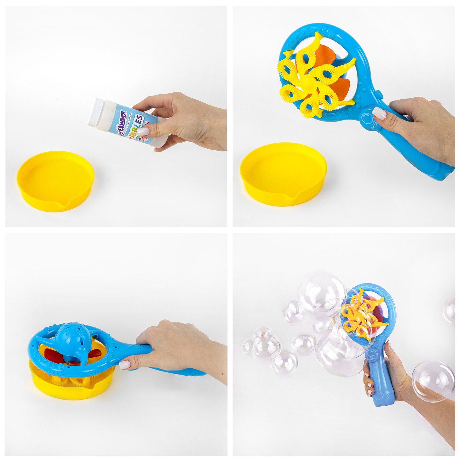 2. Налейте мыльный раствор из баночки в круглый пластиковый контейнер, входящий в набор.
