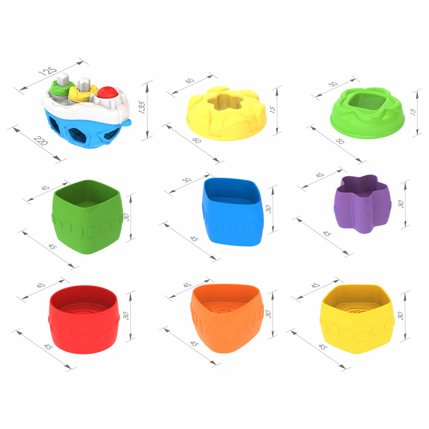 Безопасный прочный пластик, гладкие контуры, яркие цвета, которые не тускнеют со временем, оригинальный дизайн, звуковой модуль.