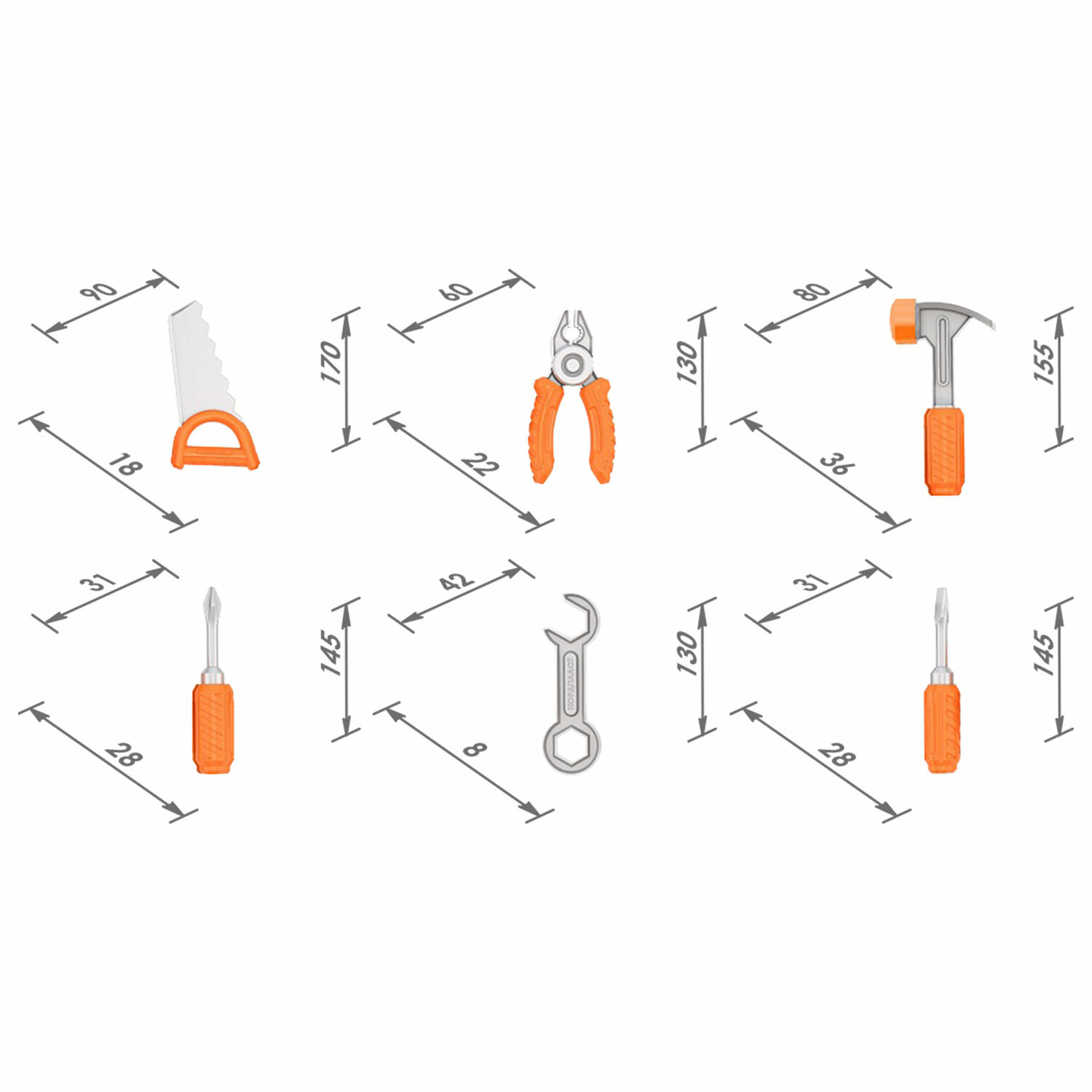 Комплектация: плоскогубцы, отвертка крестовая, отвертка с плоским шлицем, молоток, гаечный ключ, пила.