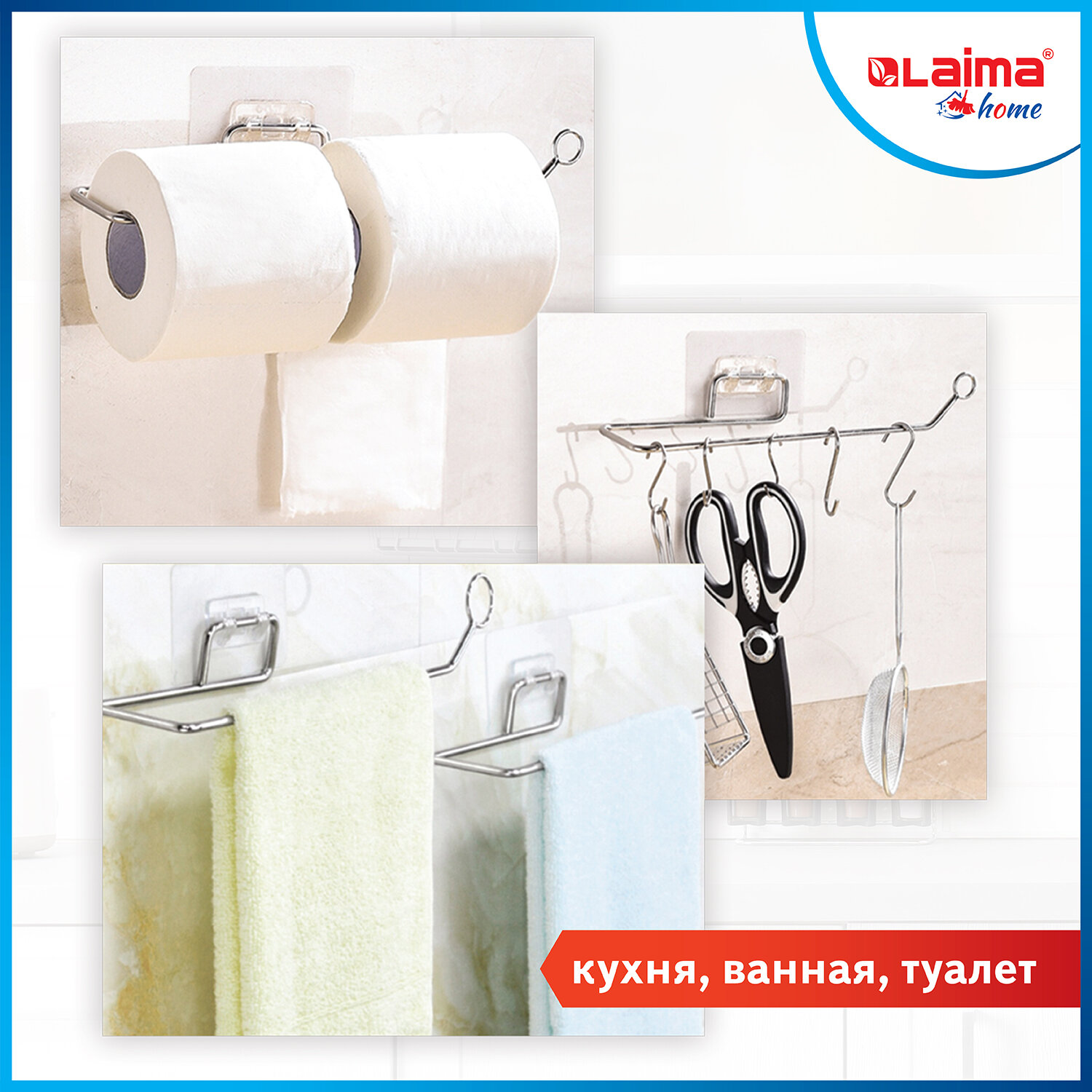 - Держатель для бумажных полотенец и рулонных салфеток самоклеящийся, хром, LAIMA HOME, 607998