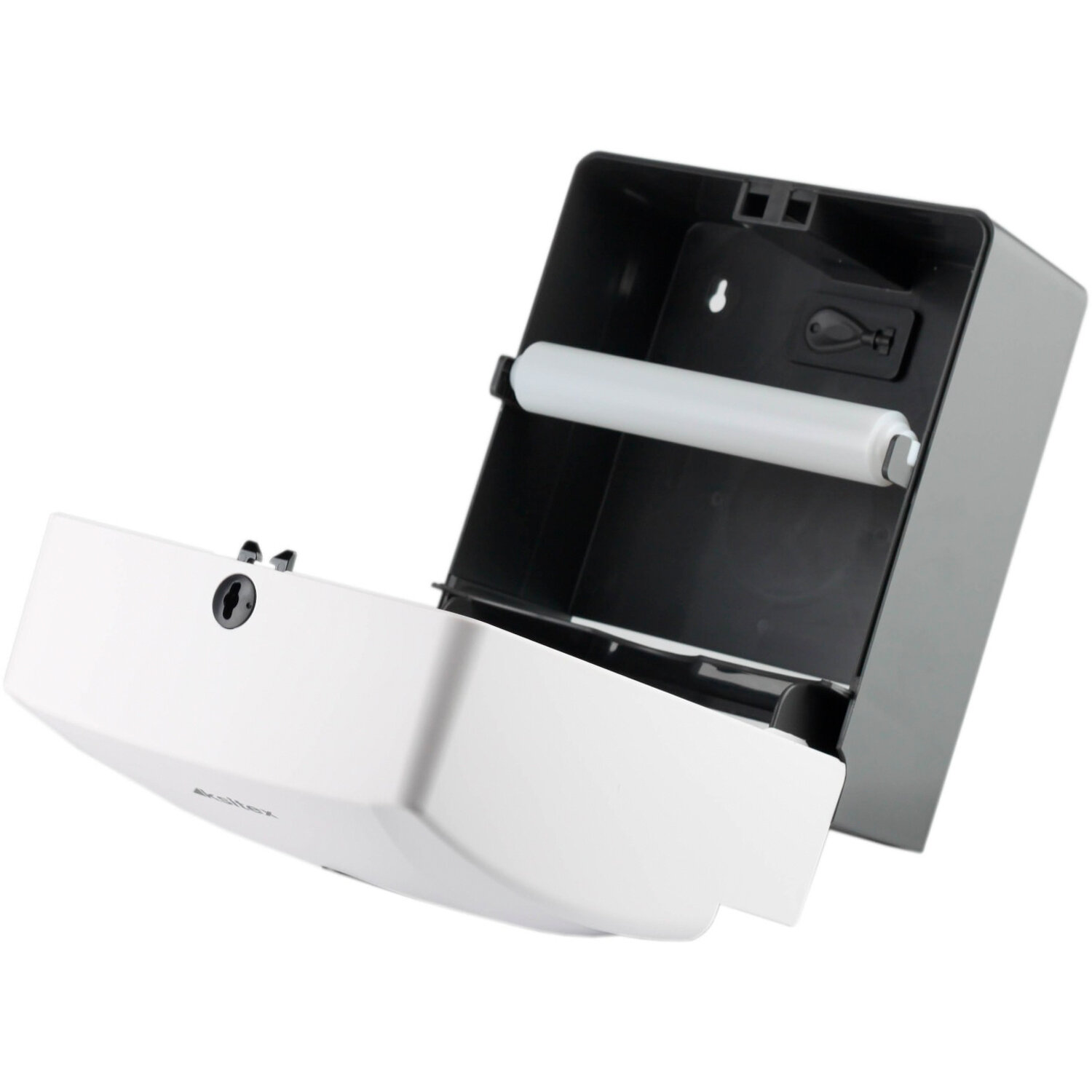 Предназначен для экономичного расхода бумажных полотенец (V)-сложения, а также рулонных полотенец. Изготовлен из пластика. Оснащен замком. Универсальное решение для туалетных комнат высокой и средней проходимости. Отвечает всем требованиям гигиены. Диспенсер для полотенец KSITEX (Система H3/Н1), ZZ (V) и в рулонах, белый, ТН-8218A