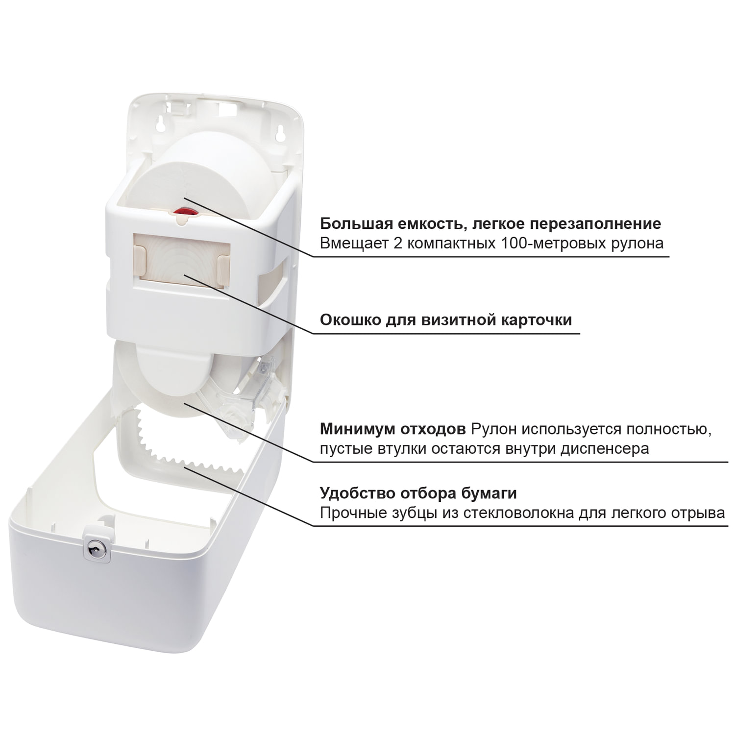 Данная модель диспенсера на 2 рулона бумаги по 100 м отличается наличием инновационной системы автоматической замены рулона, что позволяет свести его обслуживание к минимуму.