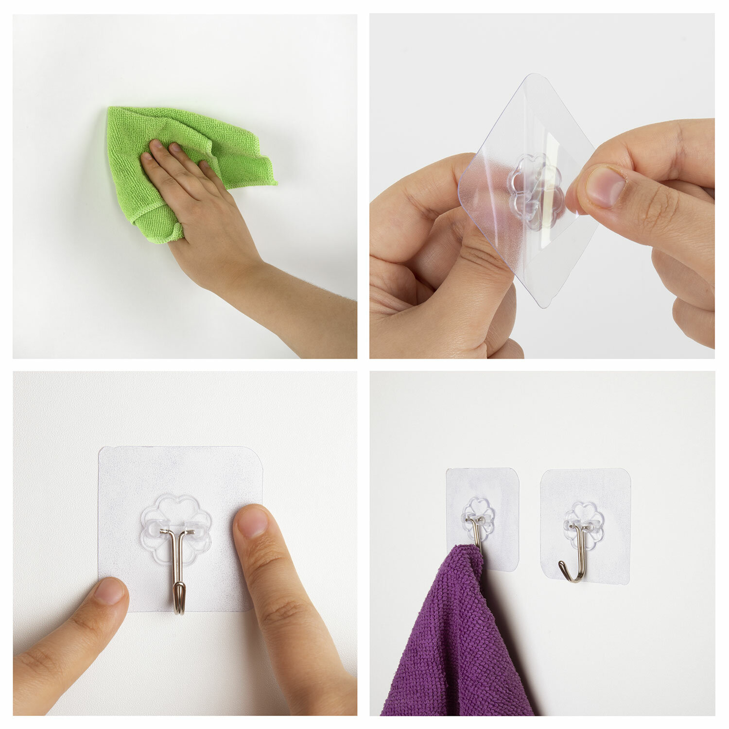 Для крепления крючка просто следуйте инструкции, приведенной на упаковке: 1) тщательно обезжирьте и высушите поверхность, на которой предполагается использовать крючок; 2) снимите защитный слой с клеевой поверхности крючка; 3) крепко прижимайте крючок к стене в течение 60 секунд; 4) используйте крючок через 24 часа после приклеивания.