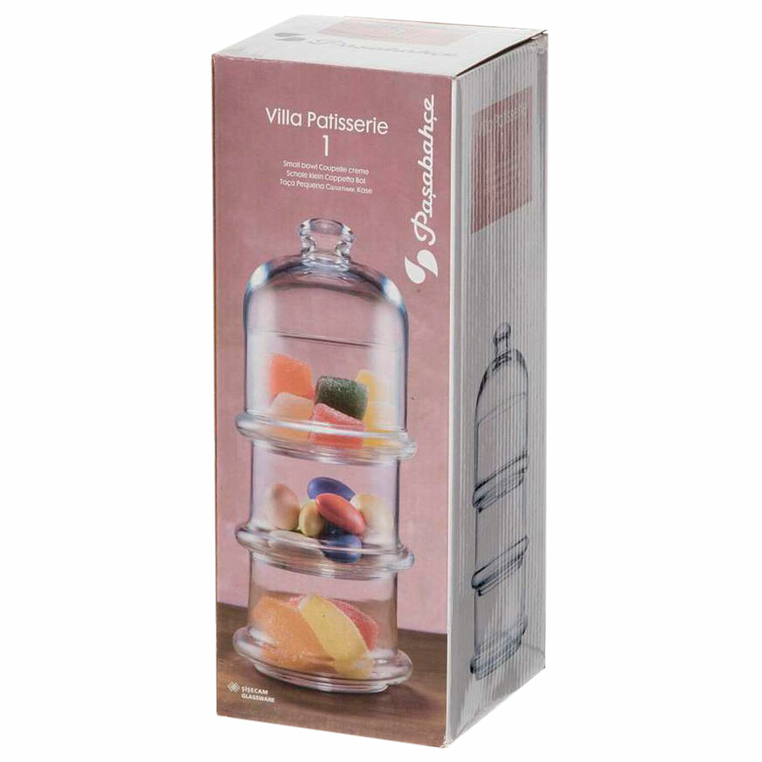 Менажница этажерка с крышкой, 3 емкости, высота 222 мм, стекло, PASABAHCE "VILLA PATISSERIE", фирменная подарочная упаковка, 96986