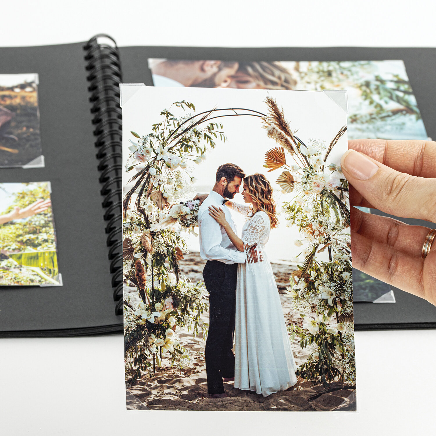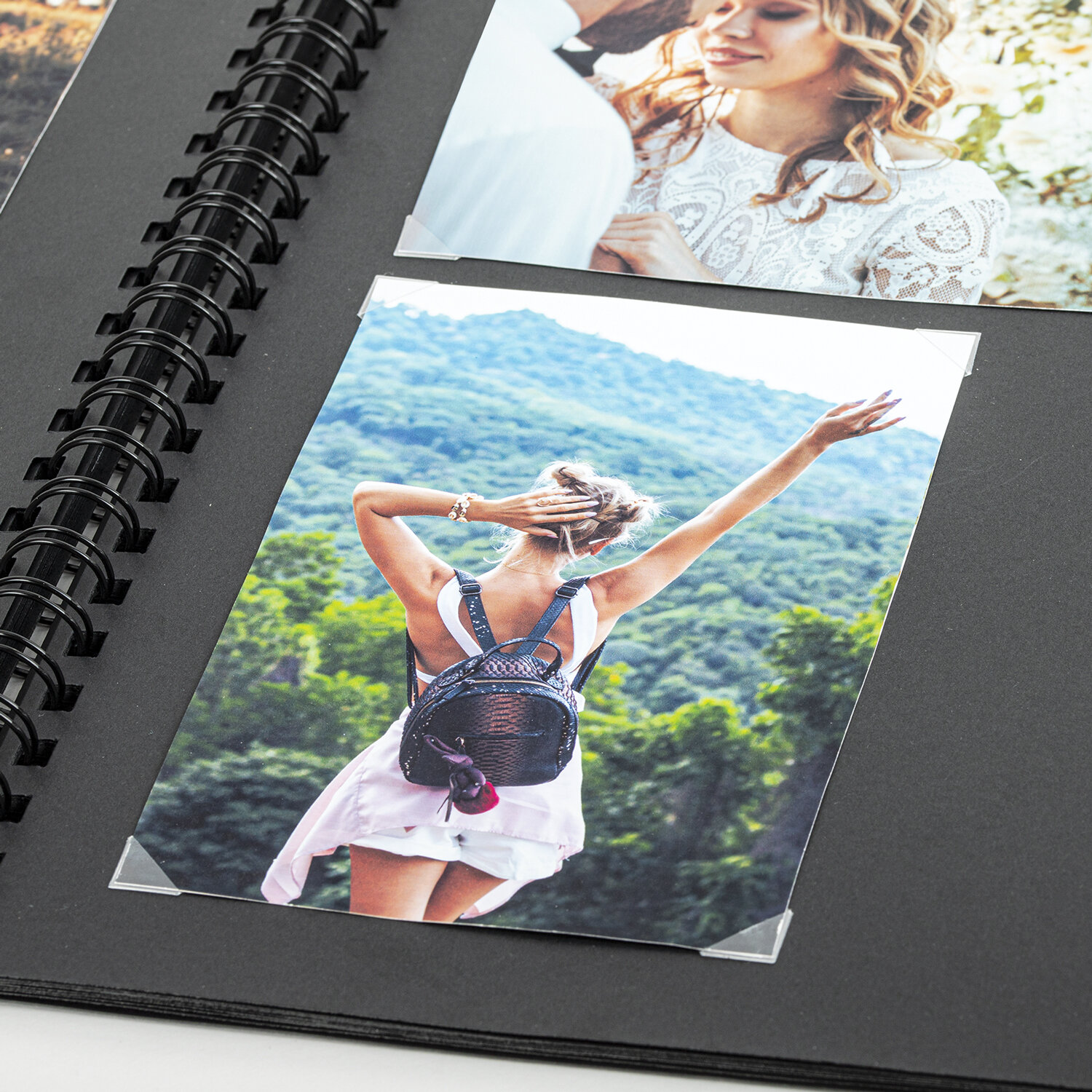 Hеобходимо отклеить каждый уголок отдельно и, измерив размер фотографии, приклеить на лист фотоальбома, памятной книги или скетчбука, таким образом, остаётся только вставить уголки фотографий в «кармашки» треугольника.