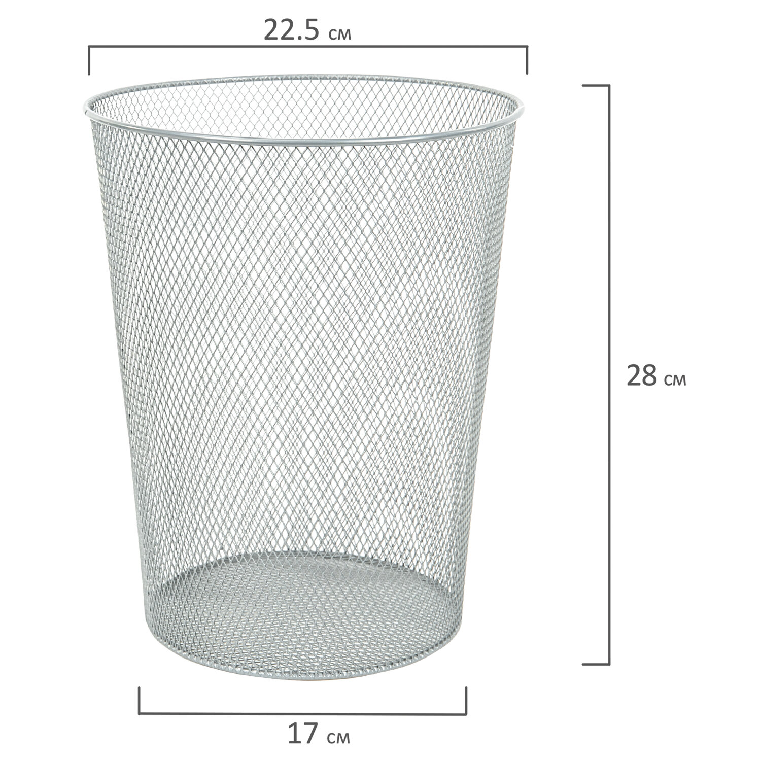 Изготовлена из металлической сетки серебристого цвета. Корпус расширяется к верху: диаметр основания составляет 17 см, а диаметр верхней части – 22,5 см. Высота – 28 см, объем – 9 л. Легкость и компактность корзины позволяют перемещать ее с одного места на другое. Корзина удобно помещается под рабочим столом. Рекомендуемый размер мешка для мусора – 32х55 см, объем – до 12 литров. Корзина для бумаг, 9 л, металлическая, серебристая, BRAUBERG "Germanium", 231959