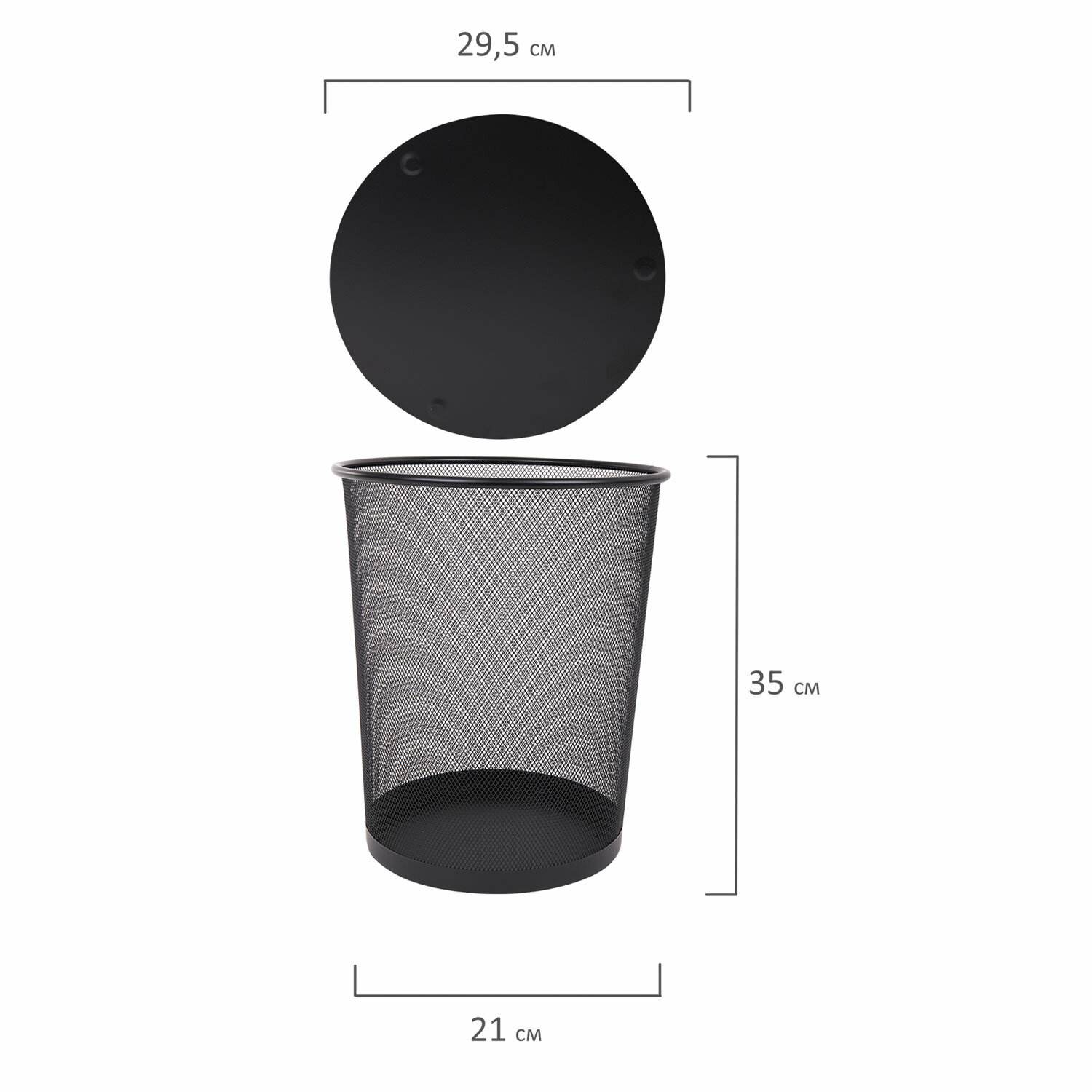 Изготовлена из металлической сетки черного цвета. Благодаря объему 20 литров способна вместить большое количество мусора. Корпус расширяется к верху: диаметр основания составляет 21 см, а диаметр верхней части – 29,5 см. Легкость и компактность корзины позволяет перемещать ее с одного места на другое. Корзина удобно помещается под рабочим столом. Рекомендуемый размер мешка для мусора – 50х60 см, объем – до 30 литров. Корзина для бумаг БОЛЬШАЯ, 20 л, металлическая, черная, BRAUBERG "Germanium", 231956