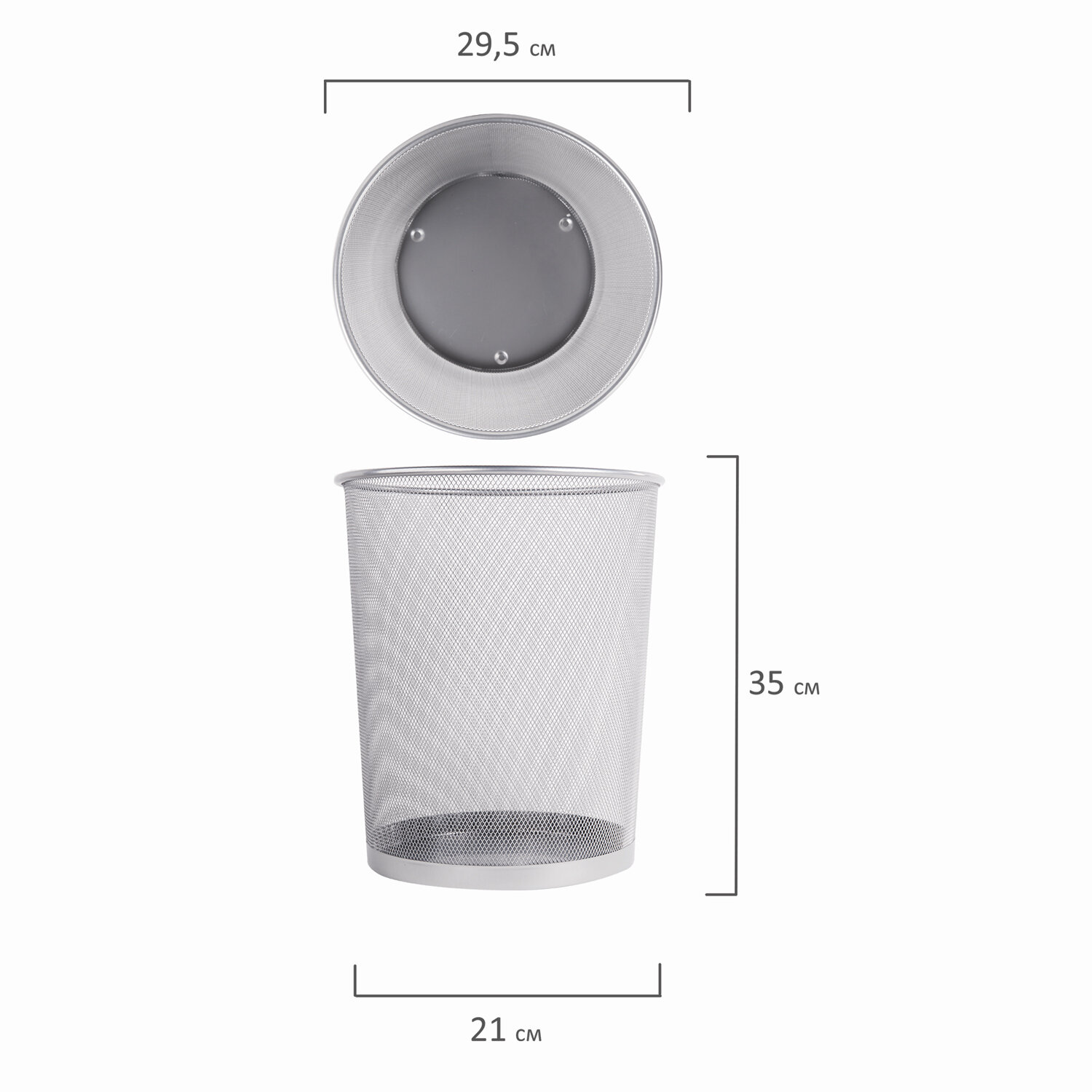 Изготовлена из металлической сетки серебристого цвета. Благодаря объему 20 литров способна вместить большое количество мусора. Корпус расширяется к верху: диаметр основания составляет 21 см, а диаметр верхней части – 29,5 см. Высота – 35 см. Легкость и компактность корзины позволяет перемещать ее с одного места на другое. Корзина удобно помещается под рабочим столом. Рекомендуемый размер мешка для мусора – 50х60 см, объем – до 30 литров. Корзина для бумаг, БОЛЬШАЯ, 20 л, металлическая, серебристая, BRAUBERG "Germanium", 231957