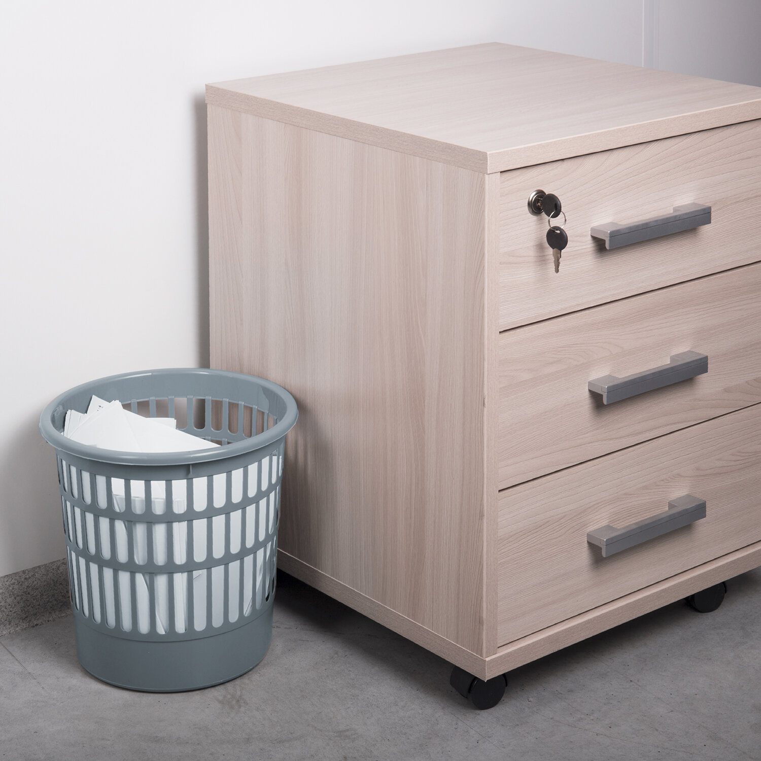 Изготовлена из высококачественного пластика серого цвета. Корпус слегка расширяется к верху: диаметр основания составляет 19,7 см, а диаметр верхней части – 26 см. Высота – 26,5 см. Легкость и компактность корзины позволяют перемещать ее с одного места на другое. Изделие легко помещается под рабочим столом. Рекомендуемый размер мешка для мусора – 32х55 см, объем – до 12 литров. Корзина для бумаг STAFF "Basic" сетчатая, 9 л, серая, 237916