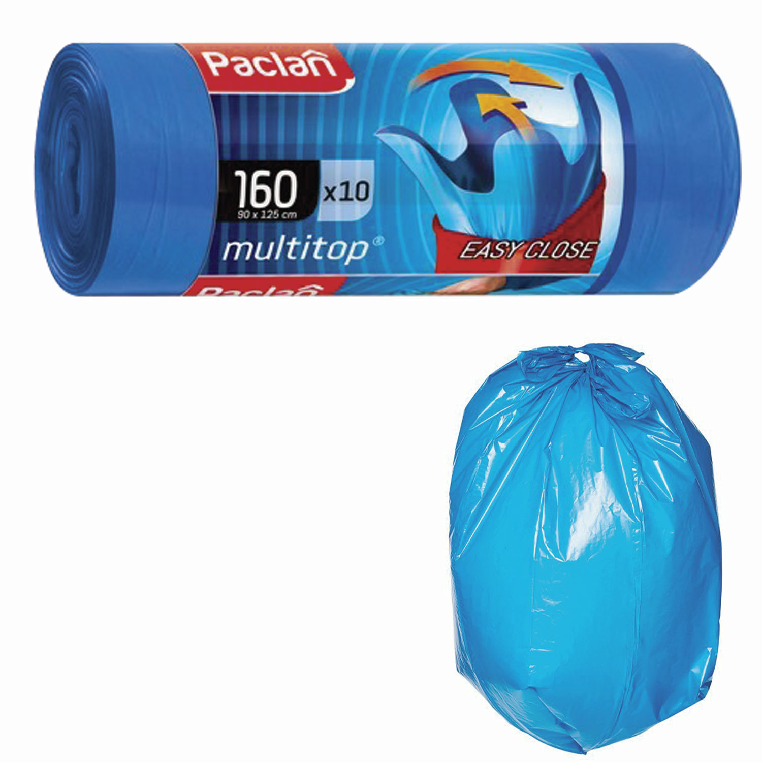 - Мешки для мусора 160 л, с ушками, синие, рулон 10 шт., ПВД, 30 мкм, 90х125 см, PACLAN "Multitop", 134442
