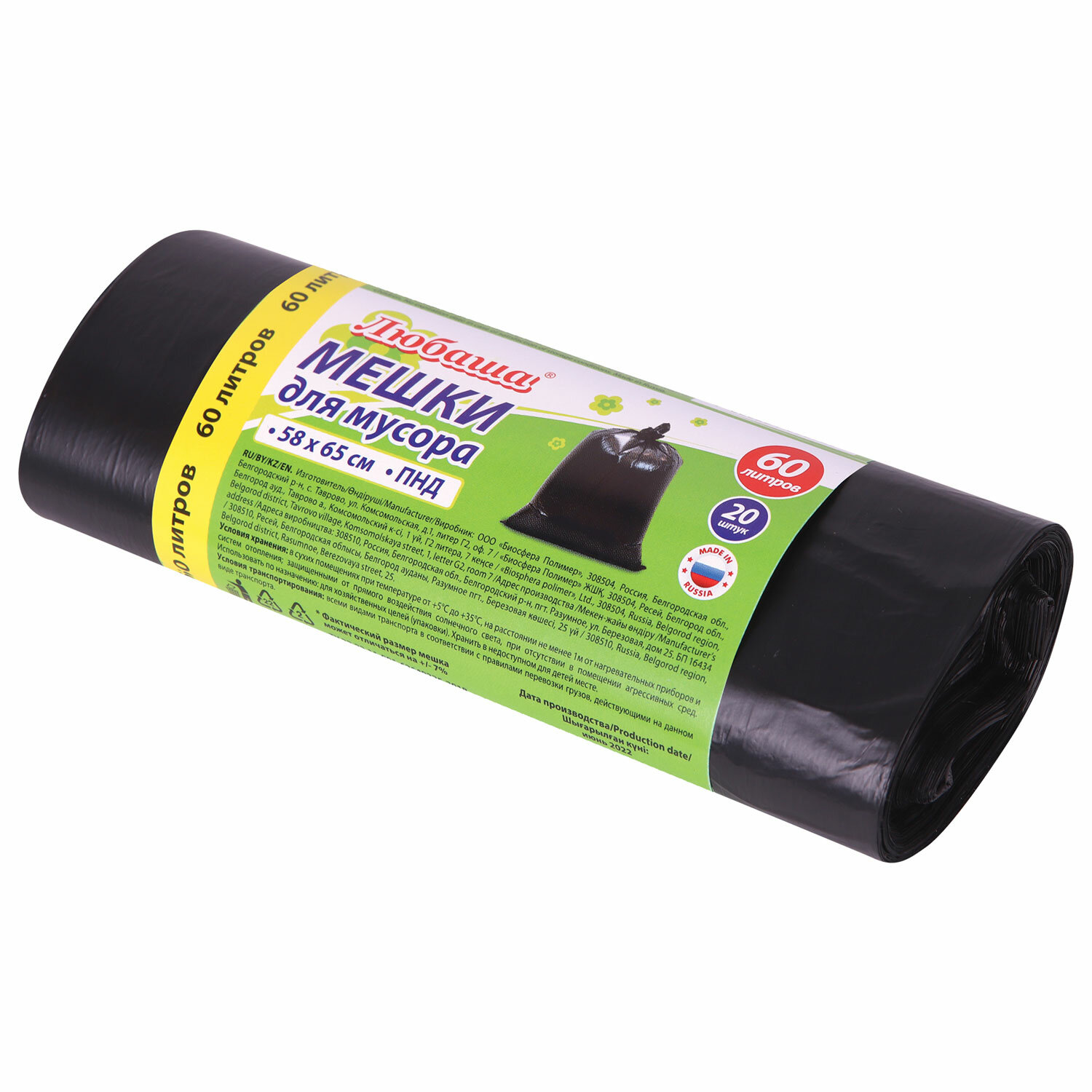 Изготовлены из полиэтилена низкого давления (ПНД) плотностью 8 микрон и имеют объем 60 литров. Размер мешка - 58х65 см (±5%). Поставляются в рулоне по 20 штук. Преимуществом данных мешков для мусора является высокая грузоподъемность. Мешки для мусора 60 л, черные, в рулоне 20 шт., ПНД 8 мкм, 58х65 см, ЛЮБАША, 608092