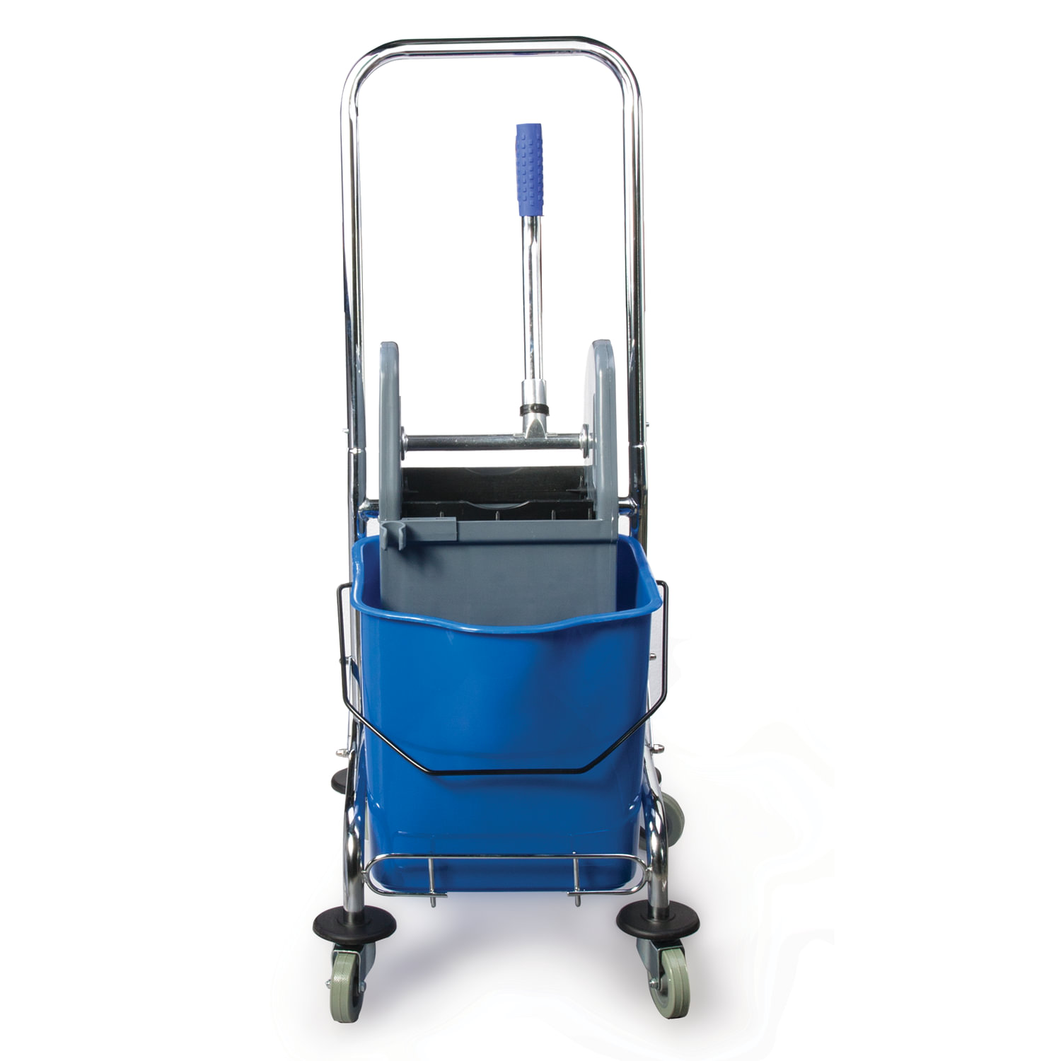 Представляет собой ведро объемом 25 л с механическим отжимом, установленное на металлической основ. База изготовлена из качественного металла, а инвентарь - из пластика. Тележка выполнена в двухцветном исполнении: синий и серый. Колеса позволяют перемещаться в произвольном направлении. Имеются защитные диски на колесах.