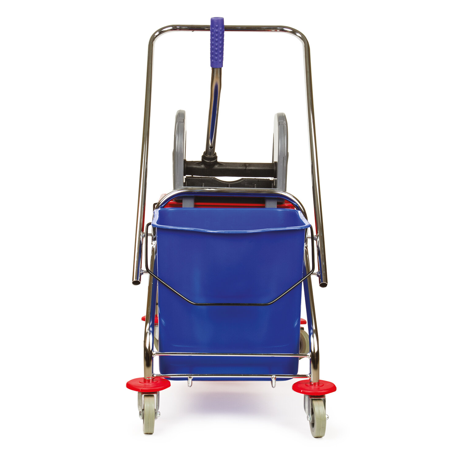 Представляет собой металлический каркас с установленными на него механическим отжимом для петельных тряпок и МОПов и 2 съемными ведрами по 25 л (рекомендованный объем каждого ведра - 20 л). База изготовлена из качественного пластика и металла, а инвентарь - из пластика. Тележка выполнена в трехцветном исполнении: красный, синий и серый. Колеса позволяют перемещаться в произвольном направлении. Имеются защитные диски на колесах.
