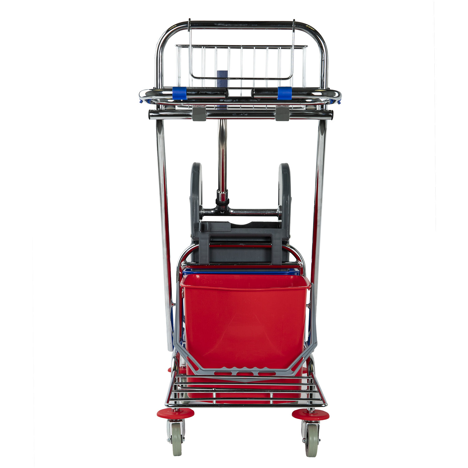 Представляет собой металлический каркас с установленным на него механическим отжимом для веревочных и плоских МОПов (плоские МОПы для удобства лучше использовать с УШАМИ (в наименовании У (УШИ) или У/К (УШИ / КАРМАНЫ), двумя съемными ведрами по 15 литров, корзиной для бытовой химии, держателем для мешка и металлическим поддоном. База изготовлена из качественного металла, а инвентарь (ведра и отжим) из пластика. Колеса позволяют перемещаться в произвольном направлении. Имеются защитные колпачки на колесах.