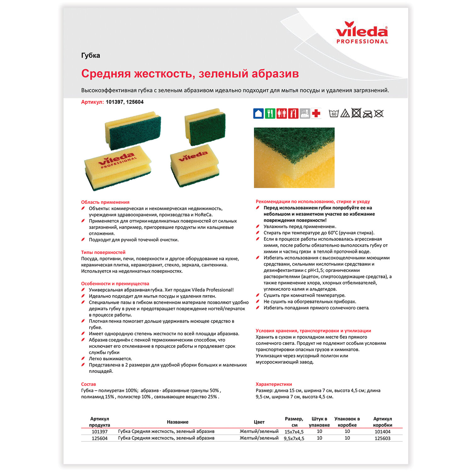 Зеленый абразив губки Vileda Professional имеет среднюю жесткость, а значит, может быть использован для удаления обычных и сильных загрязнений. Материал пенки приятен на ощупь и задерживает в себе моющее средство, что позволяет более эффективно его расходовать.