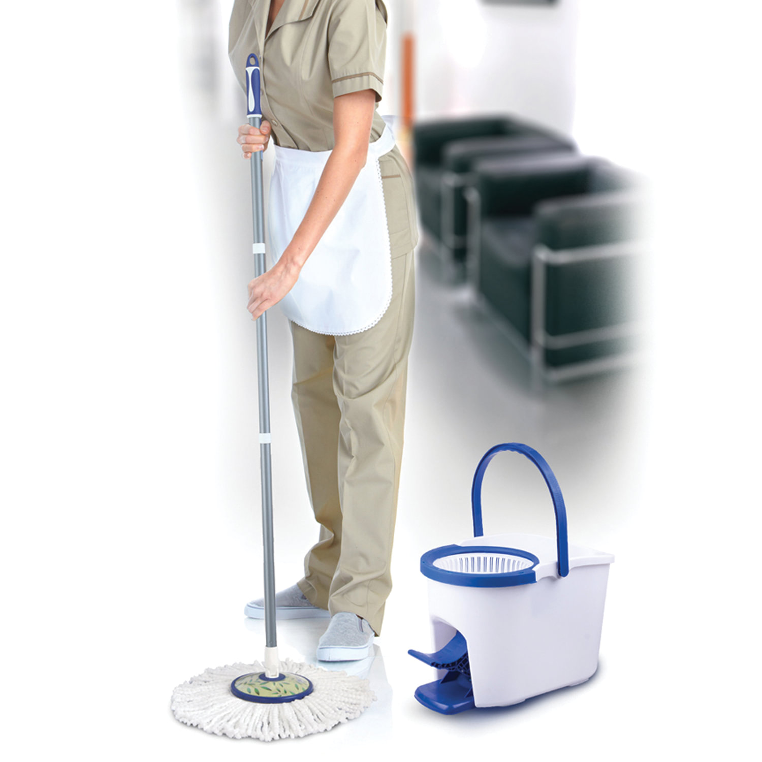 В набор входит: ведро с системой отжима (центрифуга с педальным приводом), швабра с круглой насадкой из микрофибры (входит в комплект).