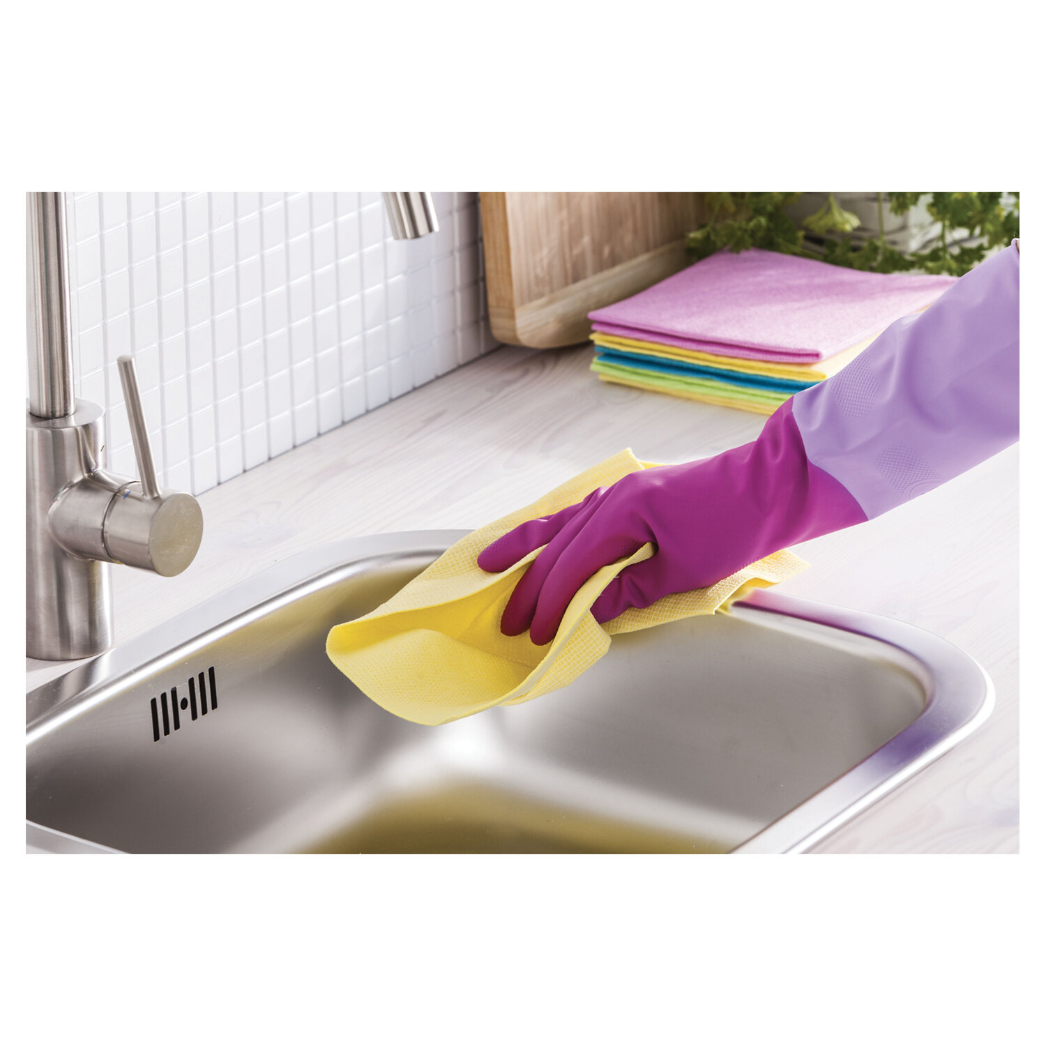 Текстура на пальцах и ладони облегчает захват и предотвращает выскальзывание предметов из рук. Удлиненная манжета защищает руки от контакта с водой. Изготовлены на 100% из натурального латекса. Перчатки МНОГОРАЗОВЫЕ резиновые YORK "Роза", хлопчатобумажное напыление, ПРОЧНЫЕ, размер L (большой), розовые, вес 75 г, 92680
