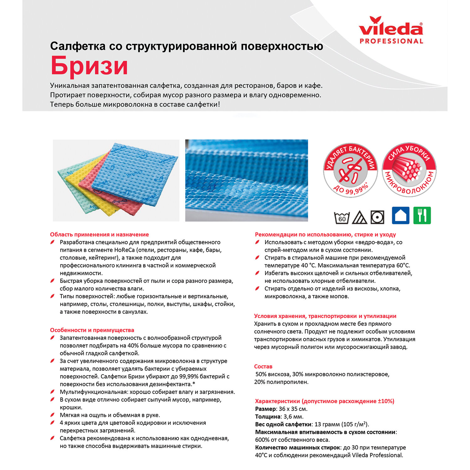 t;Бризиt; демонстрирует очень хорошие результаты как с методом «ведро-вода», так и со спрей-методом уборки. Может использоваться на всех водостойких поверхностях, таких как столешницы, серванты, барные стойки, столы и т.д. Также t;Бризиt; хорошо подходит для чистки всех поверхностей в санузле. Салфетка VILEDA "Бризи", КОМПЛЕКТ 25 шт., объемное микроволокно, голубая, 35х35 см, 120124