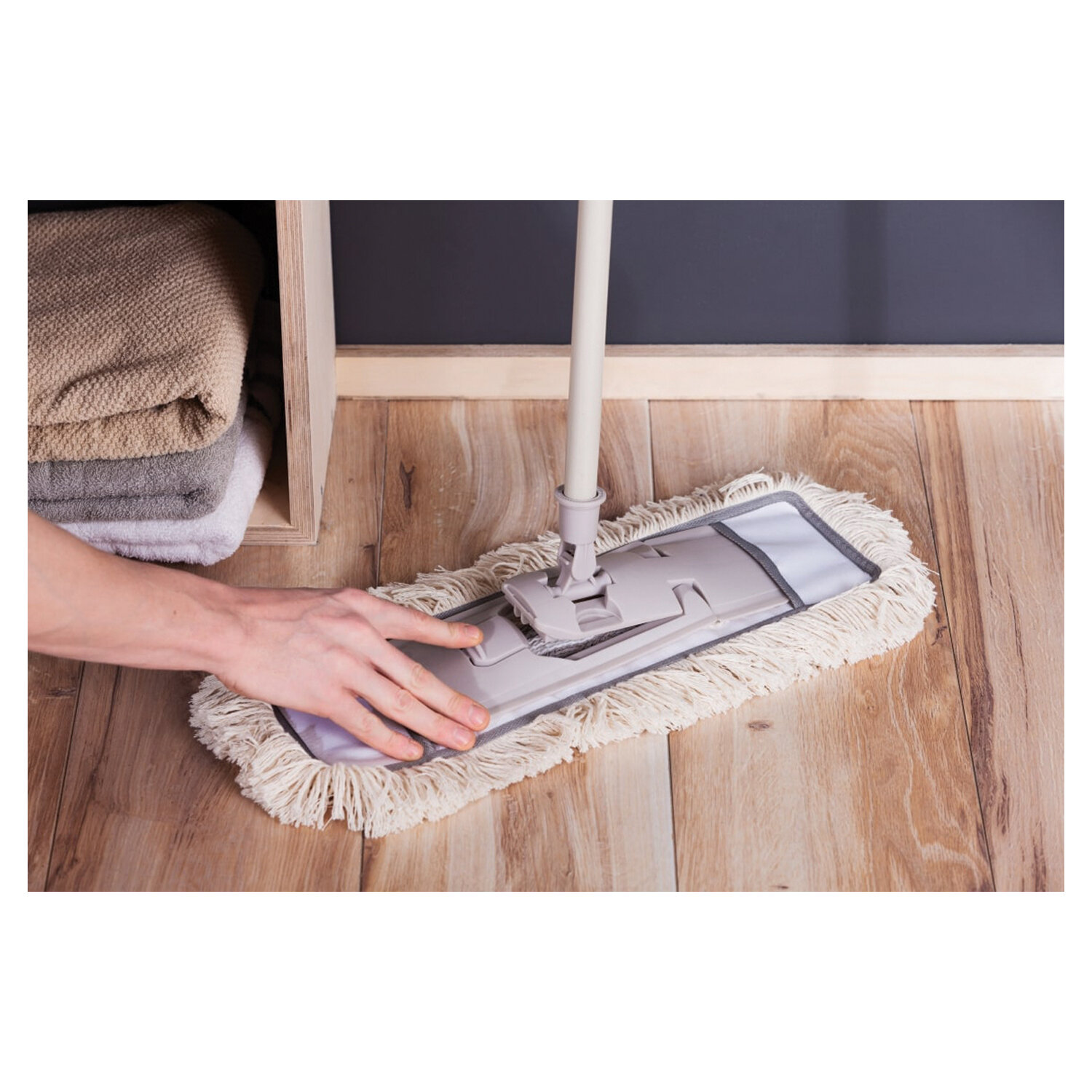 Швабра для мытья пола ECO t;Naturalt; сочетает в себе современный дизайн и эффективность в использовании! Экологически чистый продукт: насадка изготовлена из микрофибры и переработанного хлопка, платформа – из вторично-переработанного пластика, рукоятка – из стали. Большой размер насадки позволяет быстрее и эффективнее вымыть пол.
