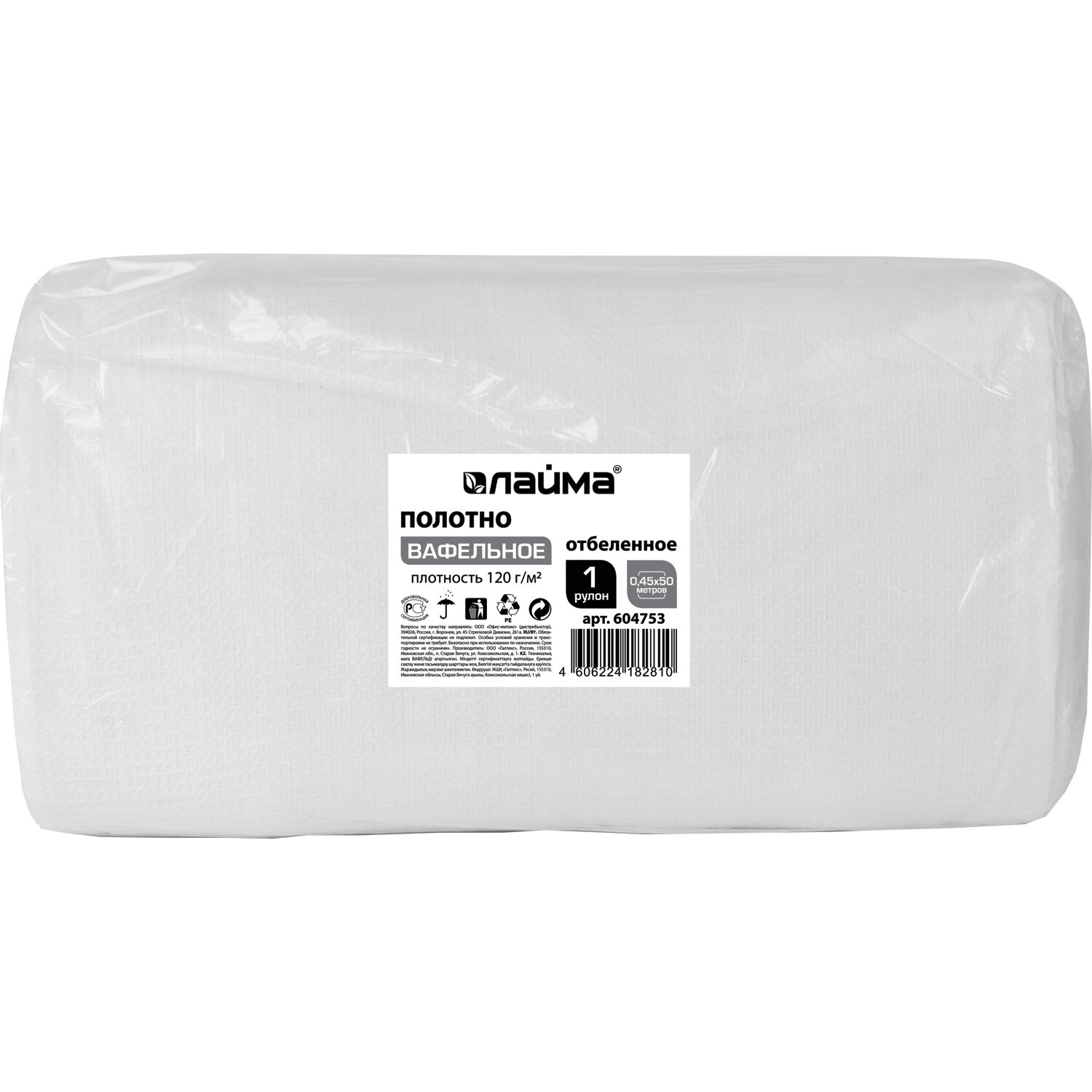 Каждый рулон упакован в плотный полиэтиленовый пакет во избежание загрязнения. Полотно ВАФЕЛЬНОЕ отбеленное, рулон 0,45х50 м, плотность 120 (±10) г/м2, LAIMA, 604753, ГС