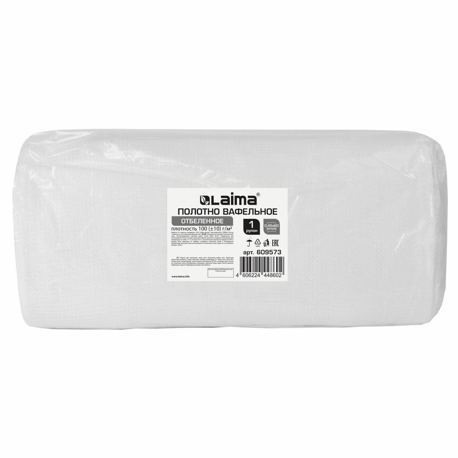 - Полотно ВАФЕЛЬНОЕ отбеленное, рулон 0,45х60 м, в пакете, плотность 100 (±10) г/м2, LAIMA, 609573