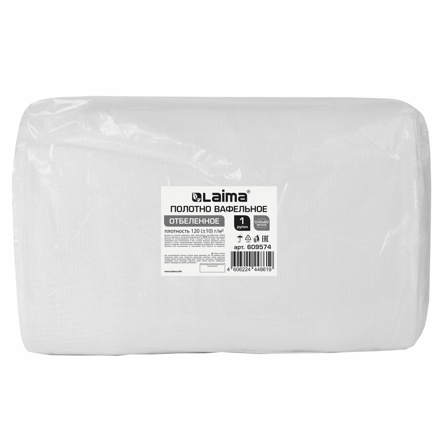 - Полотно ВАФЕЛЬНОЕ отбеленное, рулон 0,45х60 м, в пакете, плотность 120 (±10) г/м2, LAIMA, 609574