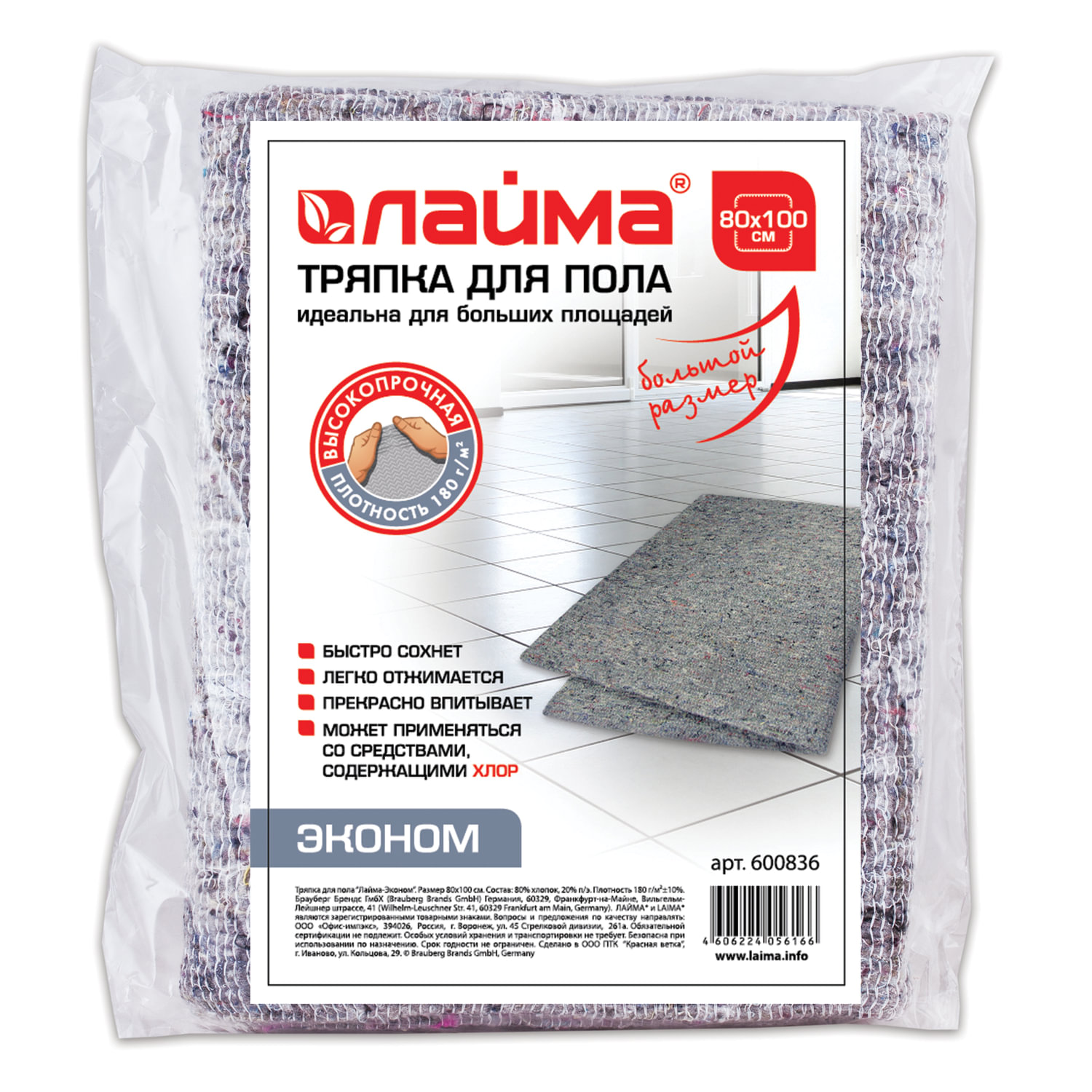 - Тряпка для мытья пола 80х100 см, плотность 180 г/м2, ХПП, 80% хлопок, 20% полиэфир, "Эконом" LAIMA, 600836