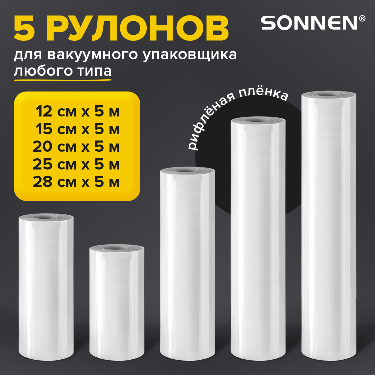 - Рулоны для вакуумного упаковщика, рифленые, НАБОР 5 шт. (12 / 15 / 20 / 25 / 28 см х 500 см), SONNEN, 456341