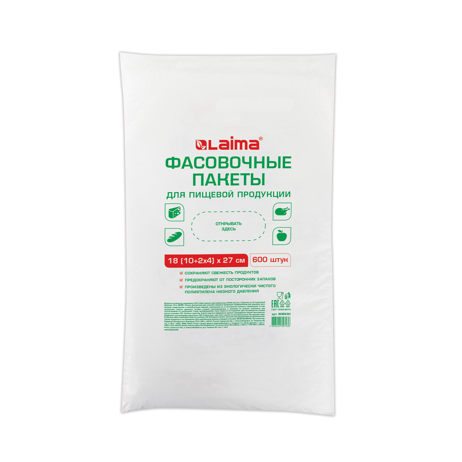 - Пакеты фасовочные 18 (10 + 2 х 4) х 27 см КОМПЛЕКТ 600 шт., ПНД 9 мкм, евроупаковка, LAIMA, 608530