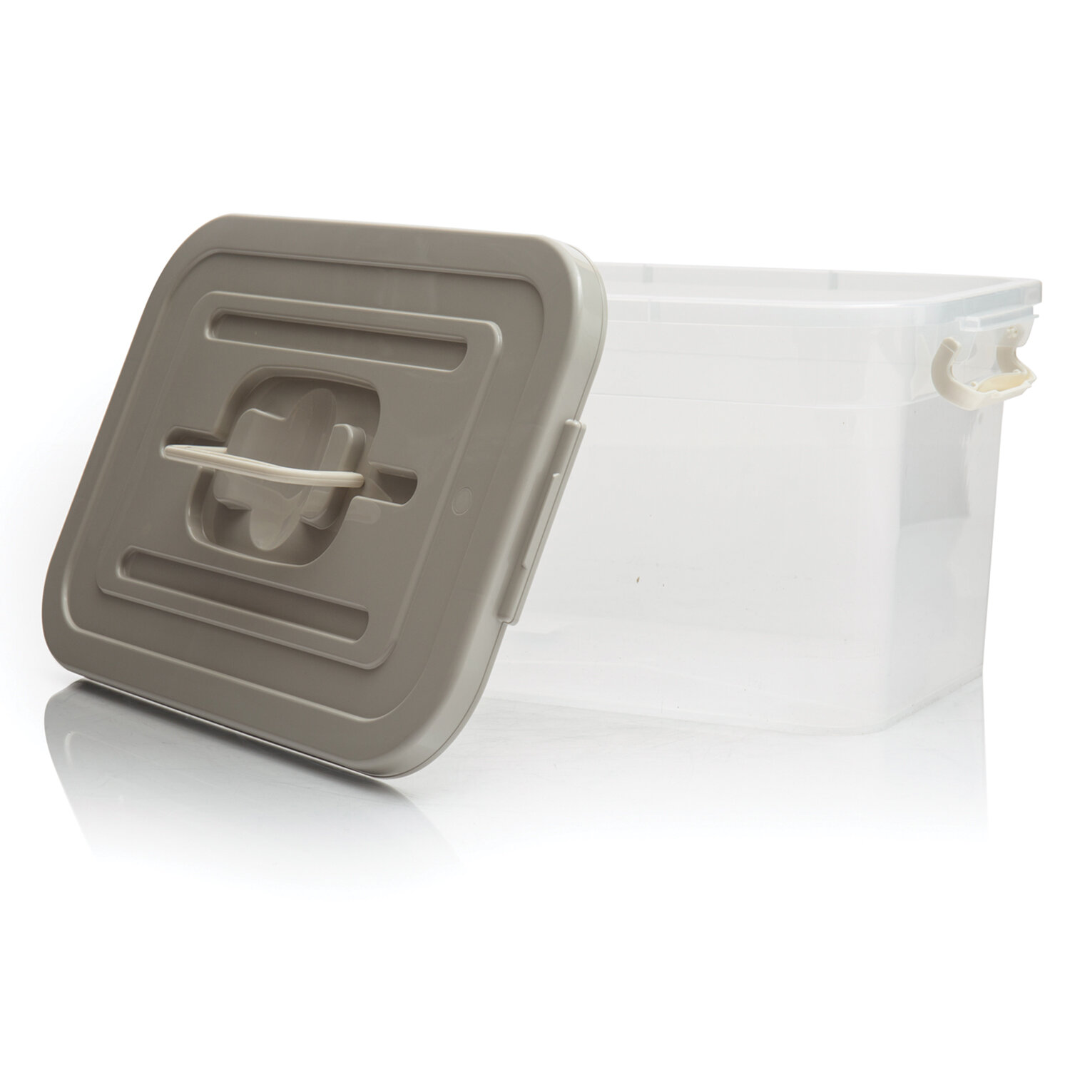 - Ящик-контейнер 10 л с КРЫШКОЙ НА ЗАЩЕЛКАХ И РУЧКОЙ, 19х35х23 см, пластик, прозрачный, крышка ассорти, 810, 438100065