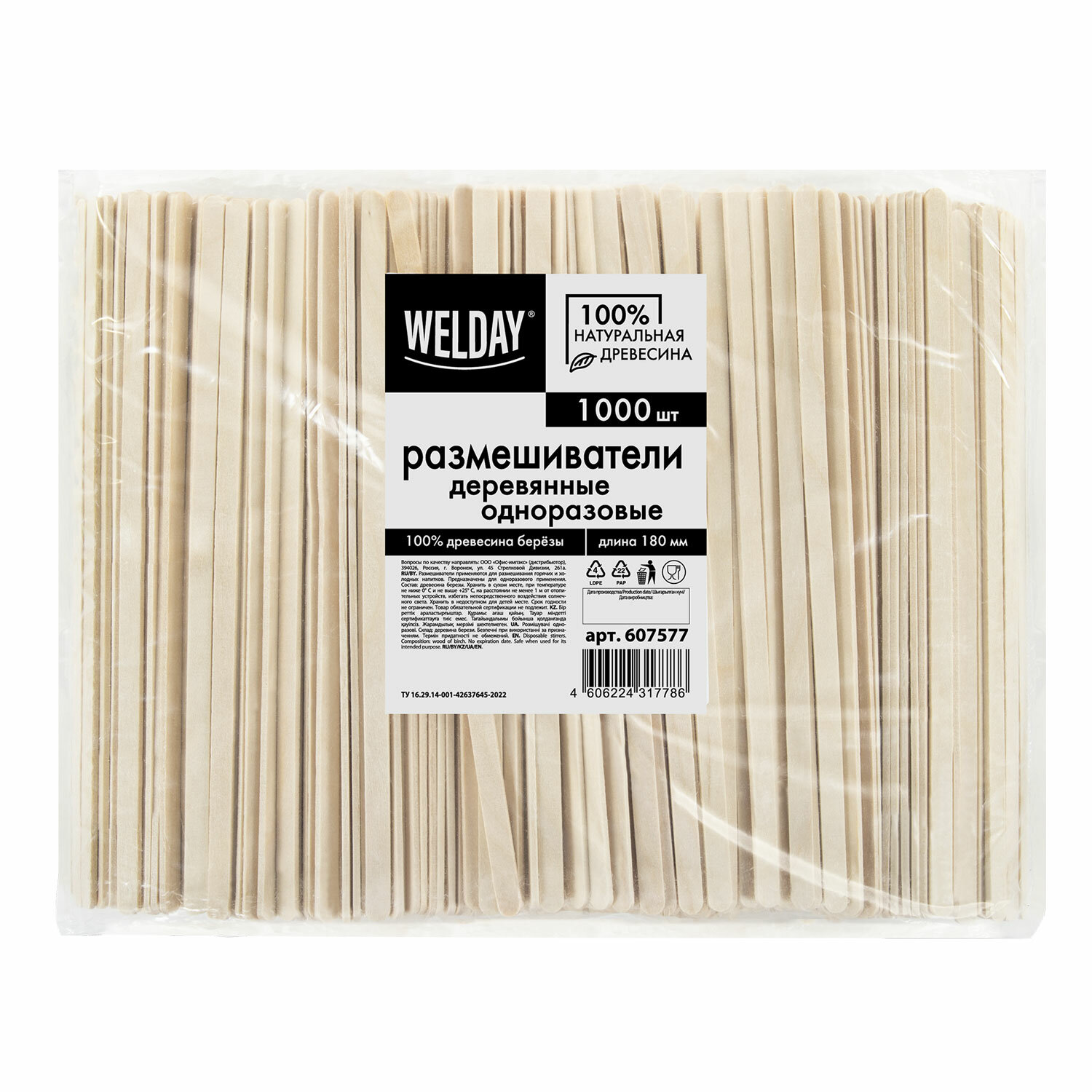 - Размешиватель одноразовый деревянный 180 мм, КОМПЛЕКТ 1000 шт., WELDAY, 607577