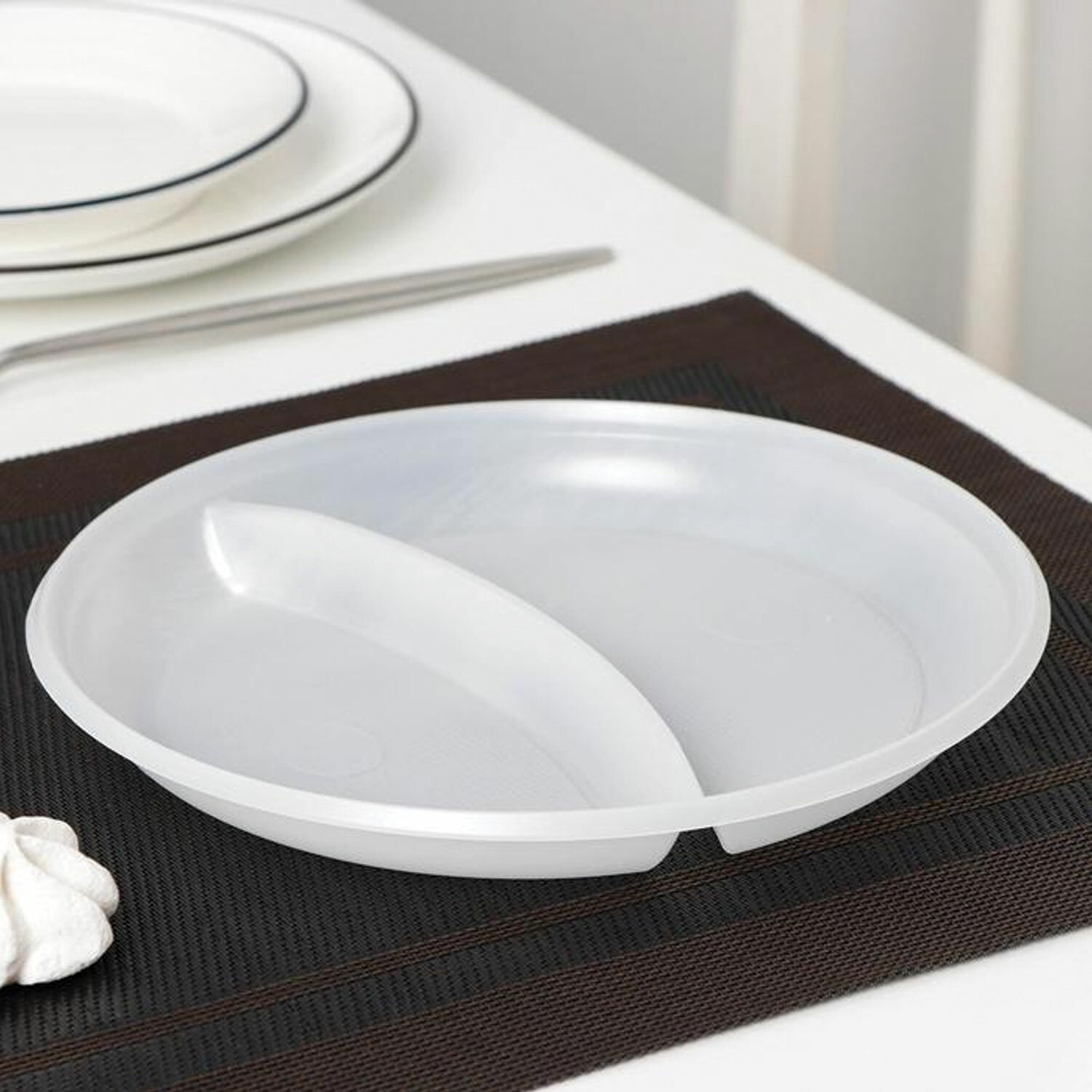 - Одноразовые тарелки 2-х секционные КОМПЛЕКТ 100 шт. 210 мм, белые, ПС, холодное/горячее, LAIMA БЮДЖЕТ, 608770