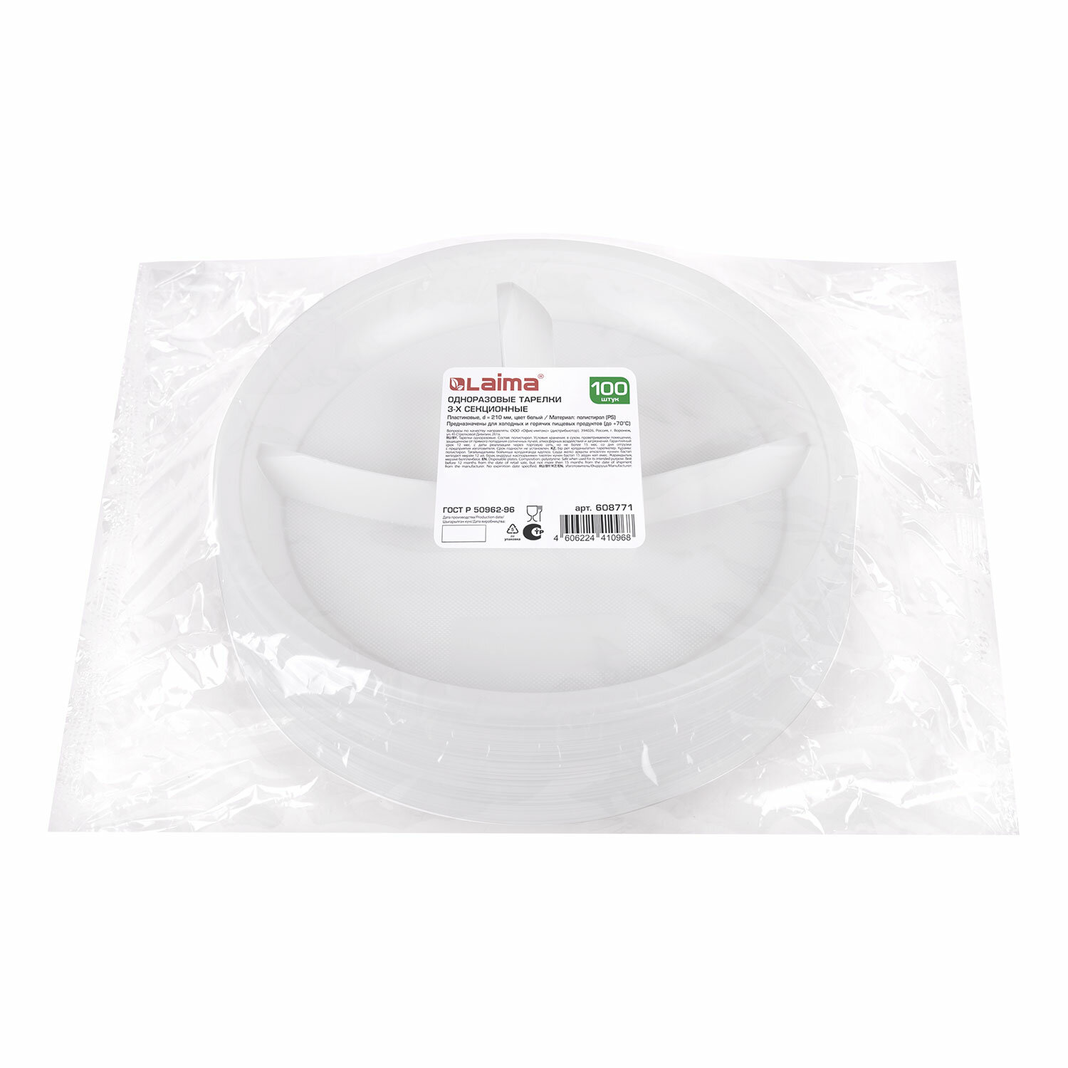- Одноразовые тарелки 3-х секционные КОМПЛЕКТ 100 шт. 210 мм, белые, ПС, холодное/горячее, LAIMA БЮДЖЕТ, 608771