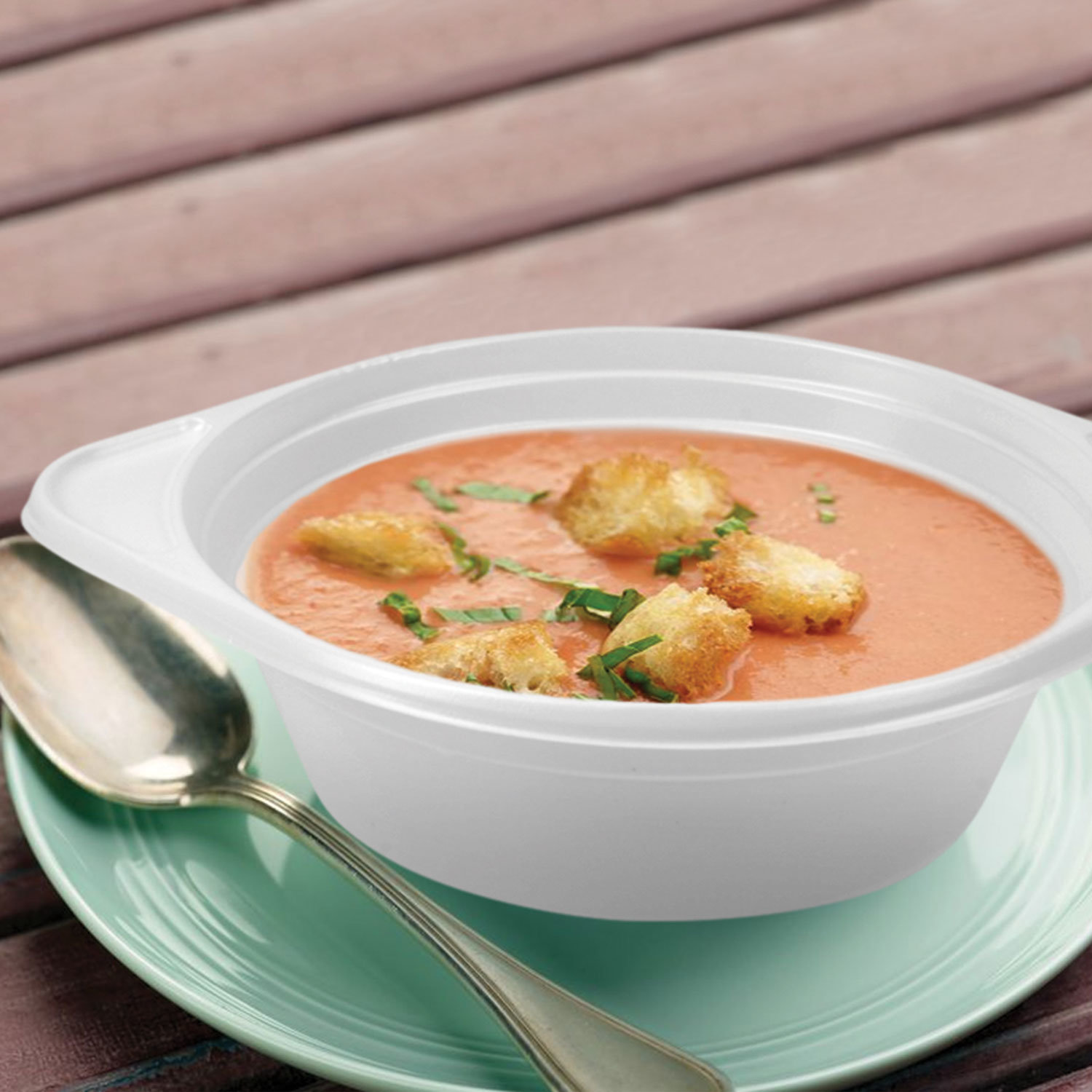 Предназначены для холодных и горячих (до +70 °С) блюд. Изготовлены из высококачественного полистирола белого цвета. Суповые тарелки диаметром 145 мм и объемом 500 мл поставляются в комплекте 100 штук.