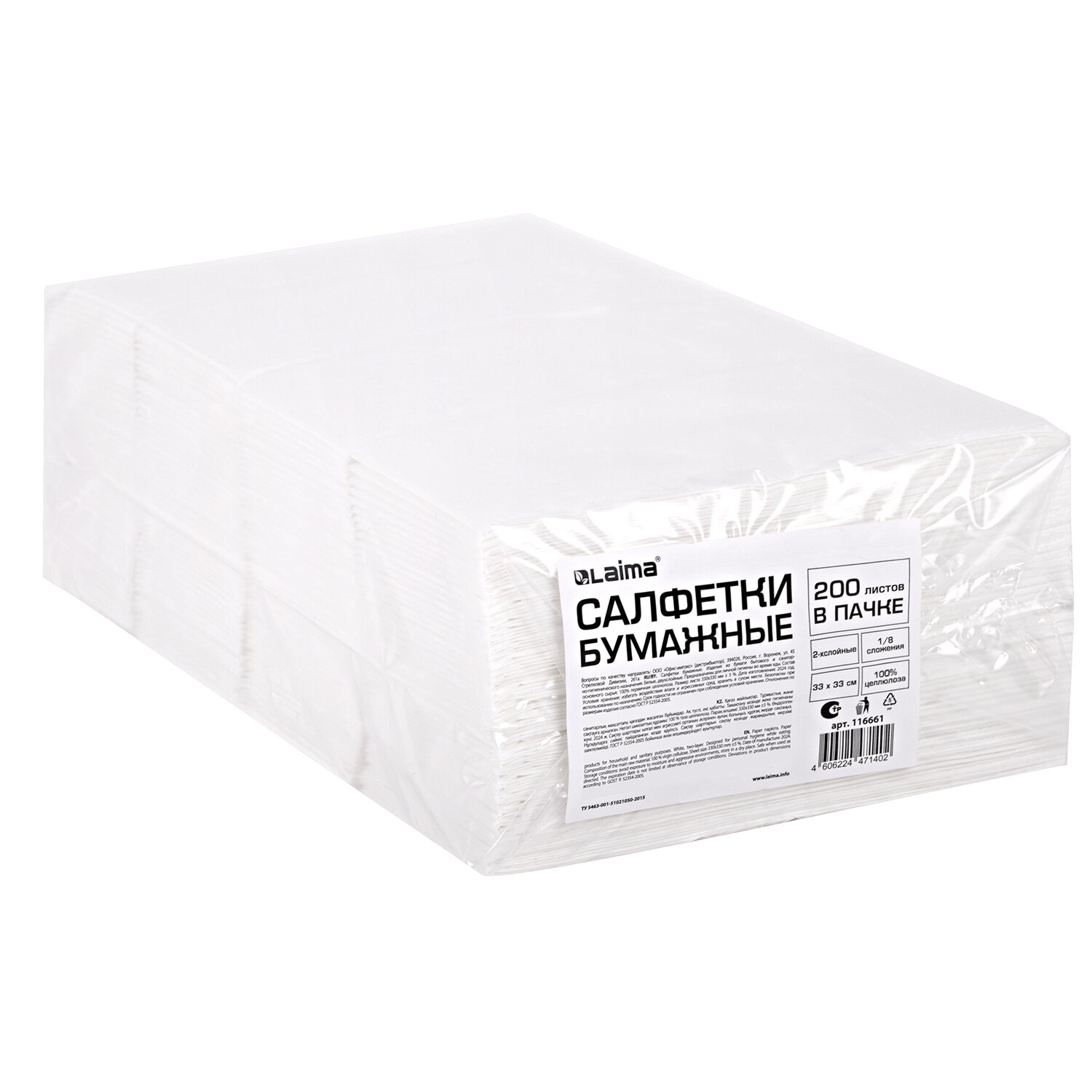 - Салфетки бумажные 2-х слойные, 33x33 см, 200 штук в упаковке, 1/8 сложение, LAIMA, 116661