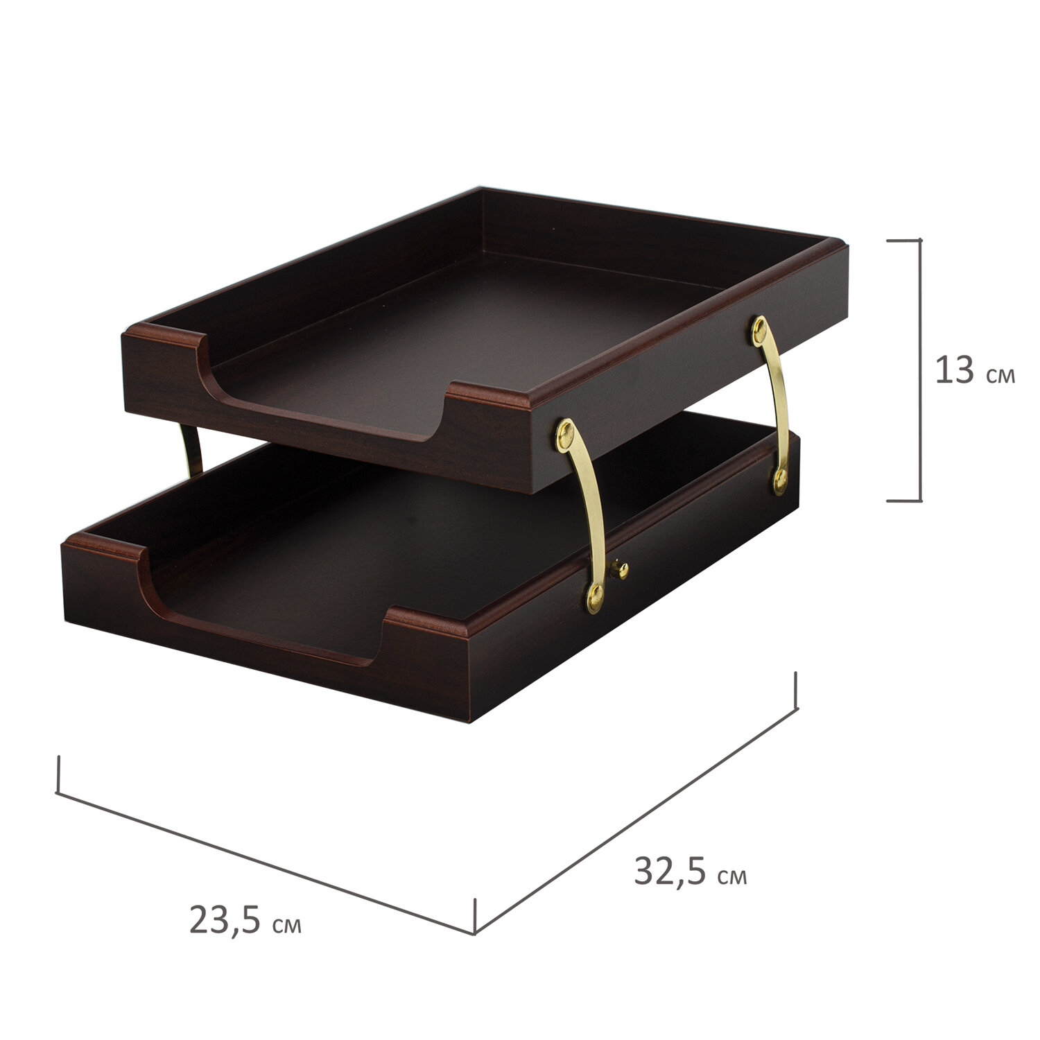 Набор состоит из 7 предметов: двойной лоток для бумаг, коврик для письма (размер – 60х42 см), подставка для ручек (2 шариковые ручки в комплекте), стакан-подставка для письменных принадлежностей, подставка для бумажного блока, нож для вскрытия конвертов, подставка для перекидного календаря. Все предметы изготовлены из дерева цвета t;орехt; с золотистой фурнитурой. Набор упакован в подарочную коробку, а также дополнительно в защитный гофрокорб для транспортировки. Набор подарочный настольный BESTAR "Ares" из дерева, 7 предметов, цвет "орех", 236356