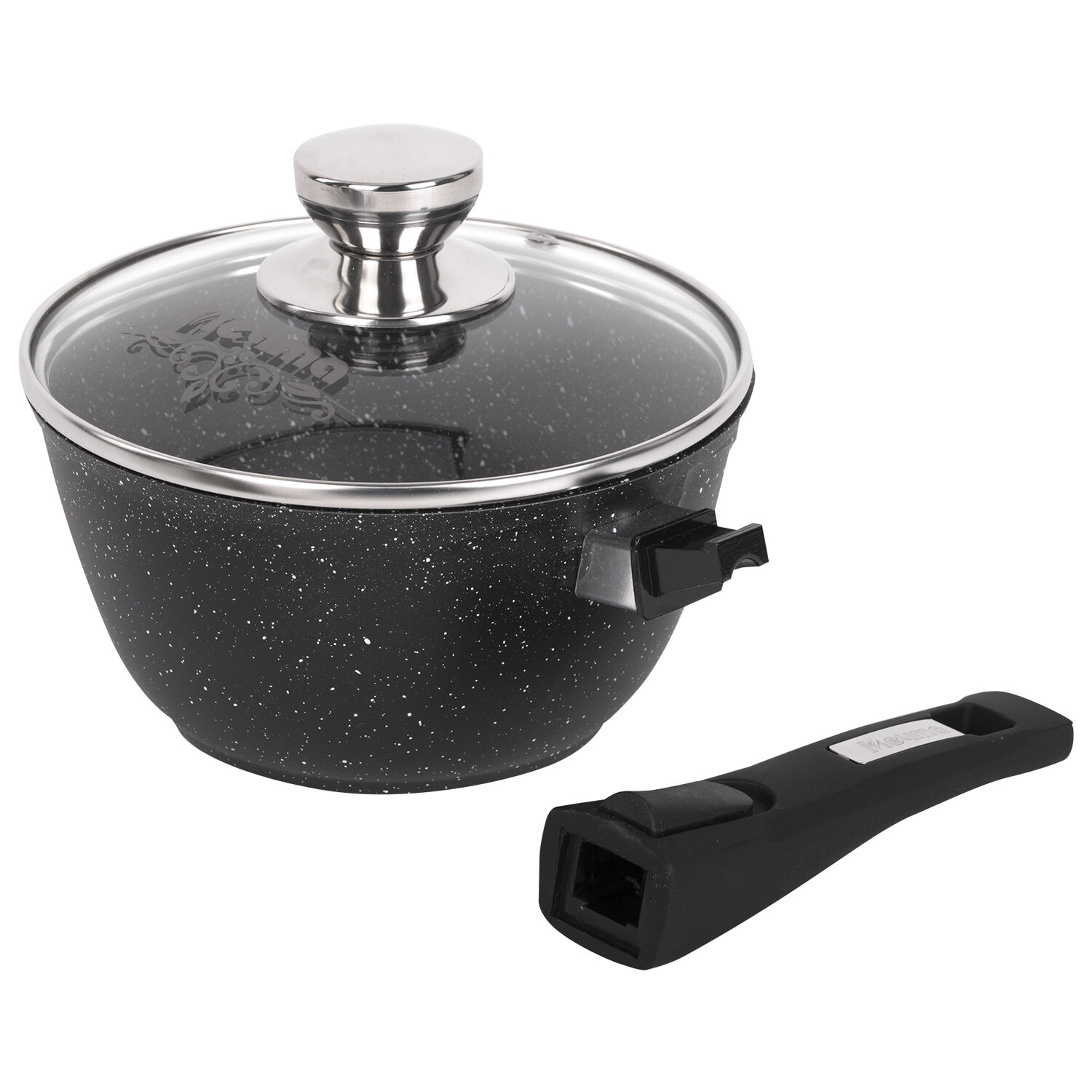 - Ковш 1,7 л, съемная soft-touch ручка, жаропрочная стеклянная крышка, антипригарное покрытие, МЕЧТА "Гранит Black", 082802