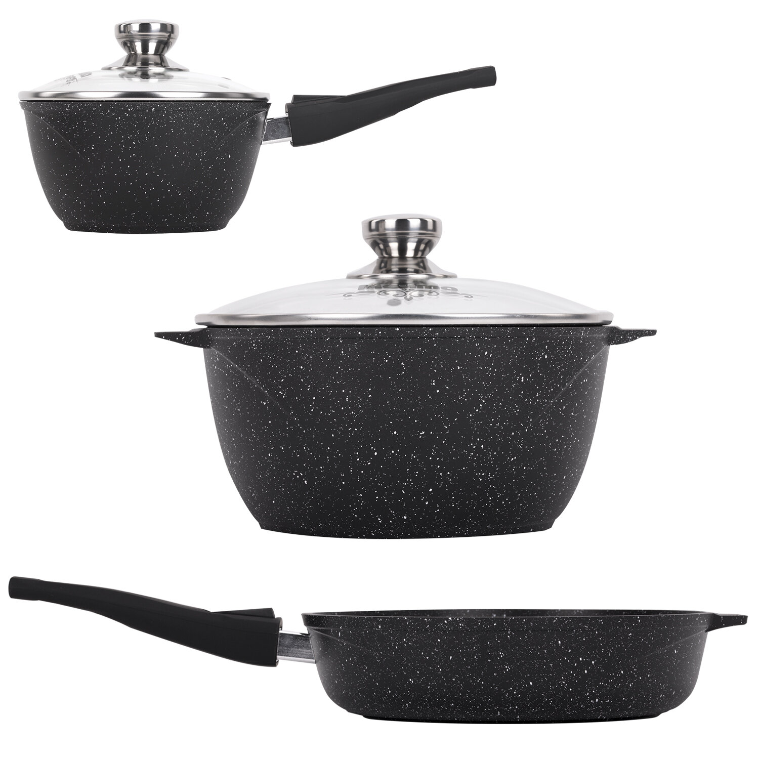 Набор посуды (сковорода 26 см, кастрюля 5 л, ковш 1,7 л, 2 съемных ручки, 2 крышки), МЕЧТА "Гранит Black", 001802