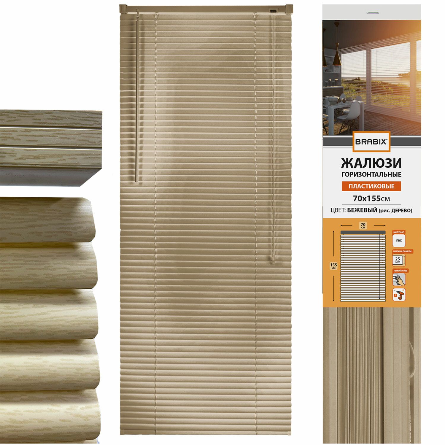 Размер – 70х155 см. Ширина ламелей – 25 мм. Жалюзи горизонтальные BRABIX 70х155 см, ПЛАСТИК, под дерево, бежевый, 608622