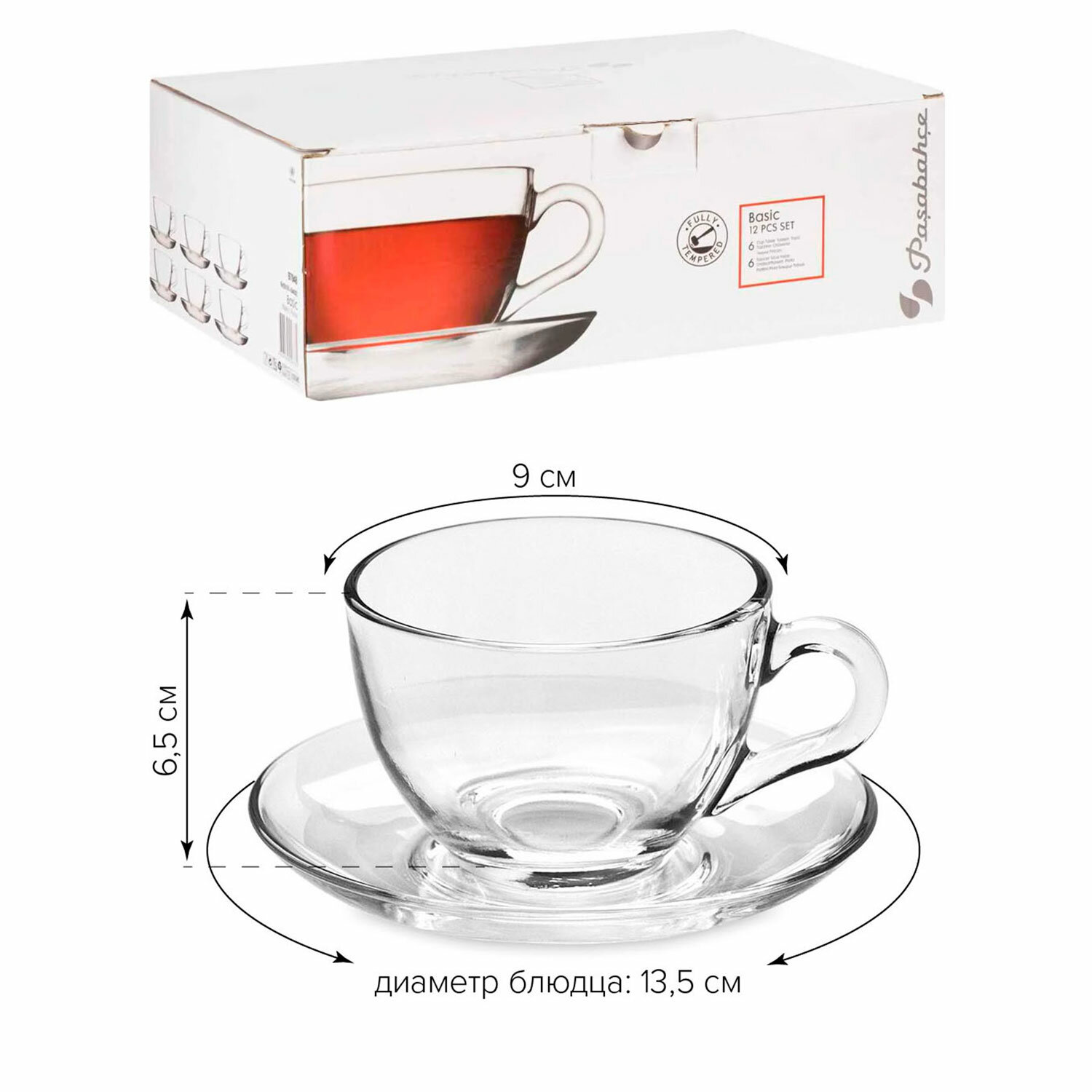 Набор чайный на 6 персон (6 кружек 215 мл, 6 блюдец), стекло, PASABAHCE "БЕЙЗИК", фирменная подарочная упаковка, 97948