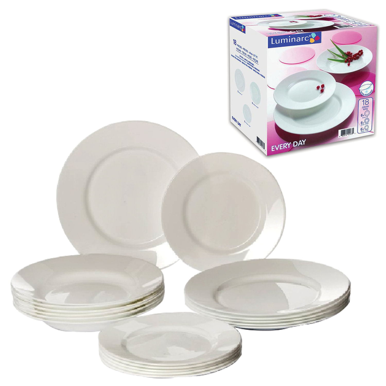 Набор столовой посуды Luminarc t;Everydayt; - это не только яркий и полезный подарок для родных и близких, а также великолепное дизайнерское решение для вашей кухни или столовой. Набор посуды столовый, 18 предметов, белое стекло, Everyday, LUMINARC, Q9318