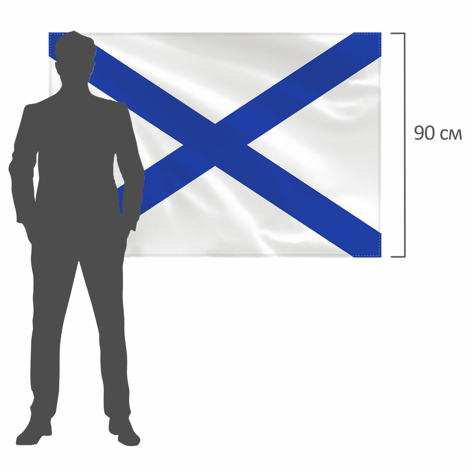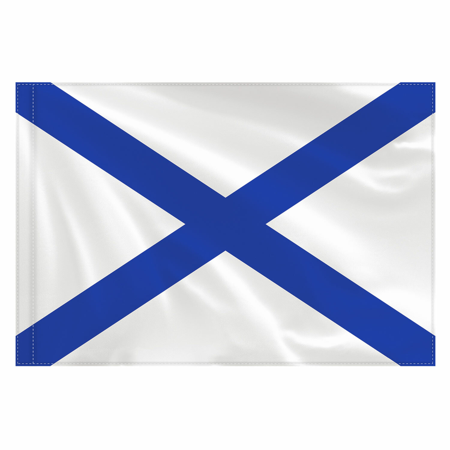 Флаг Военно-Морского Флота России t;Андреевский флагt; представляет собой прямоугольное двухстороннее полотно белого цвета, пересечённое синим диагональным (Андреевским) крестом, не содержит эмблему ВМФ. Яркое изображение с двух сторон флага.