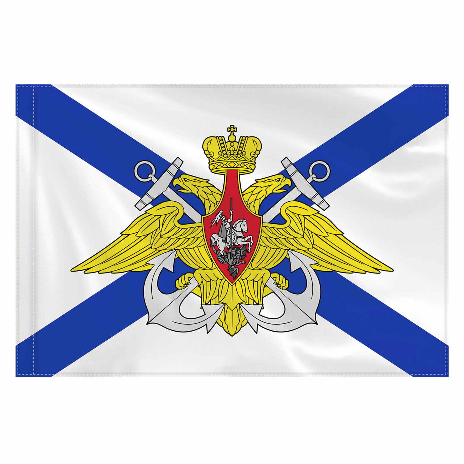 Флаг Военно-Морского Флота России t;Андреевский флагt; представляет собой прямоугольное двухстороннее полотно белого цвета, пересечённое синим диагональным (Андреевским) крестом, содержит эмблему ВМФ. Яркое изображение с двух сторон флага.