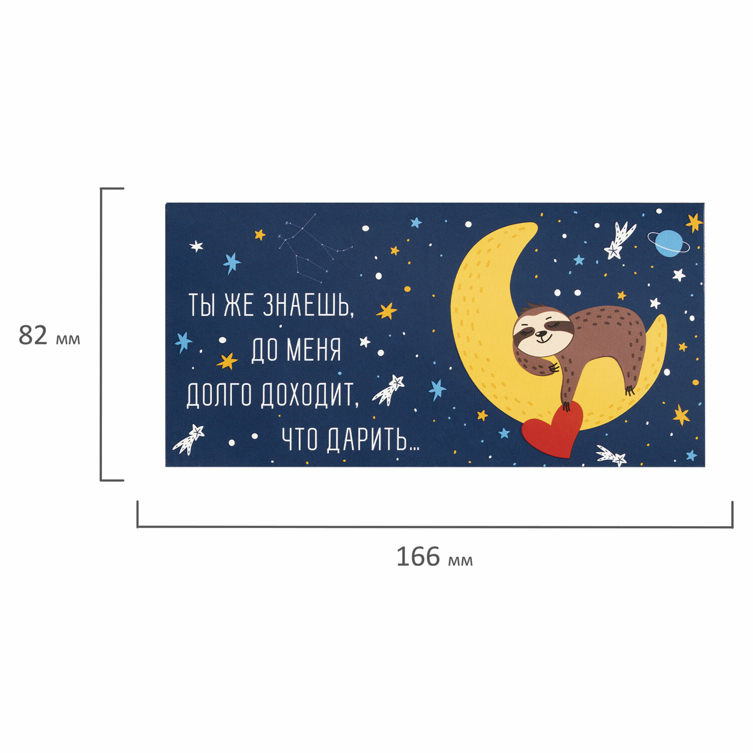 Конверт с надписью t;ДОЛГО ДОХОДИТ, ЧТО ДАРИТЬ...t; изготовлен из высококачественного картона плотностью 215 г/м2. Выполнен в синем цвете с изображением ленивца на луне. Отделка - выборочный УФ-лак. Размер - 166х82 мм. Конверт для денег "ДОЛГО ДОХОДИТ, ЧТО ДАРИТЬ...", 166х82 мм, выборочный лак, ЗОЛОТАЯ СКАЗКА, 113746