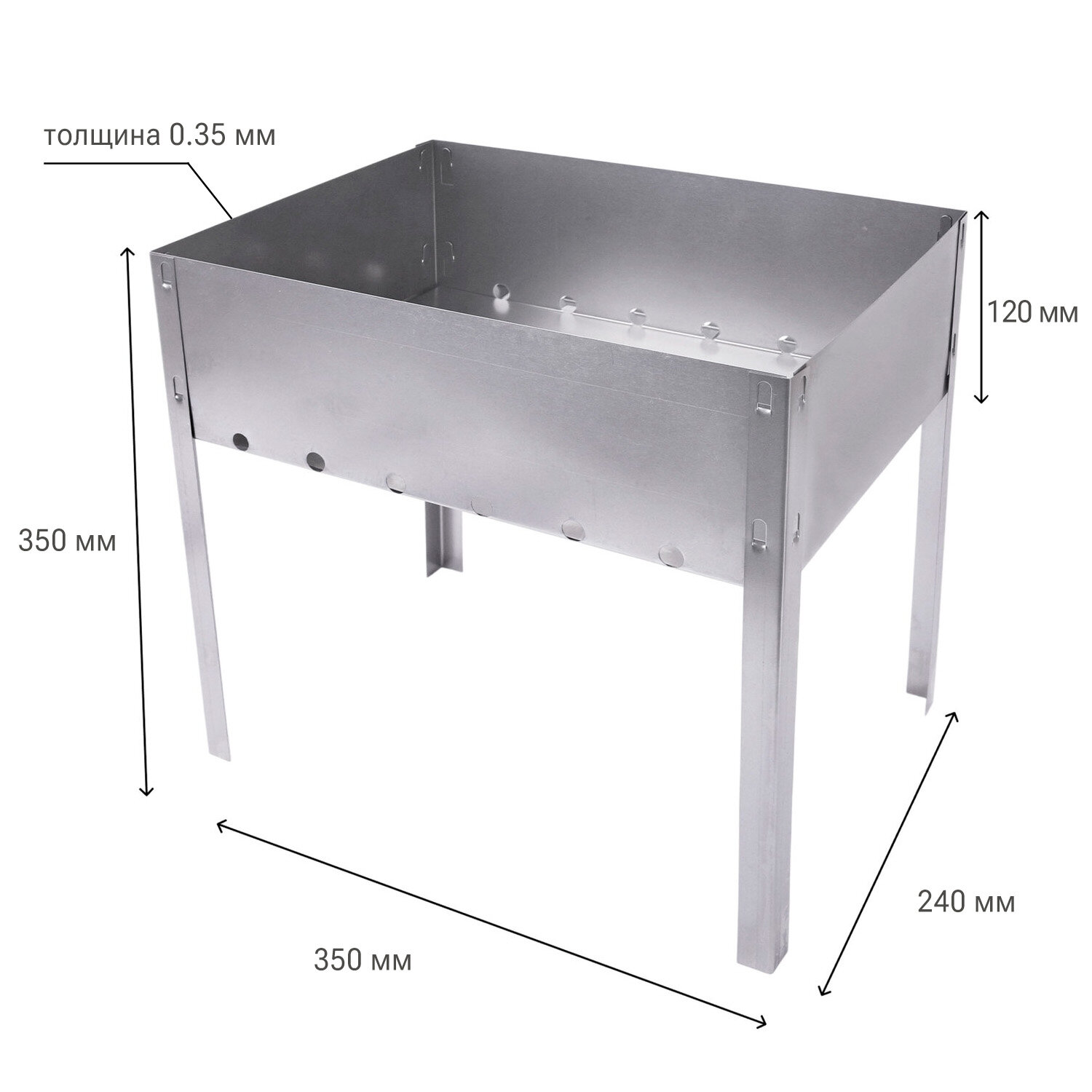 Мангал сборный из стали. Практичен в использовании: удобные длинные ножки создают комфортные условия для приготовления блюд. Компактные габариты 350х240х350 мм позволяют легко переносить мангал и быстро подготавливать его к использованию.