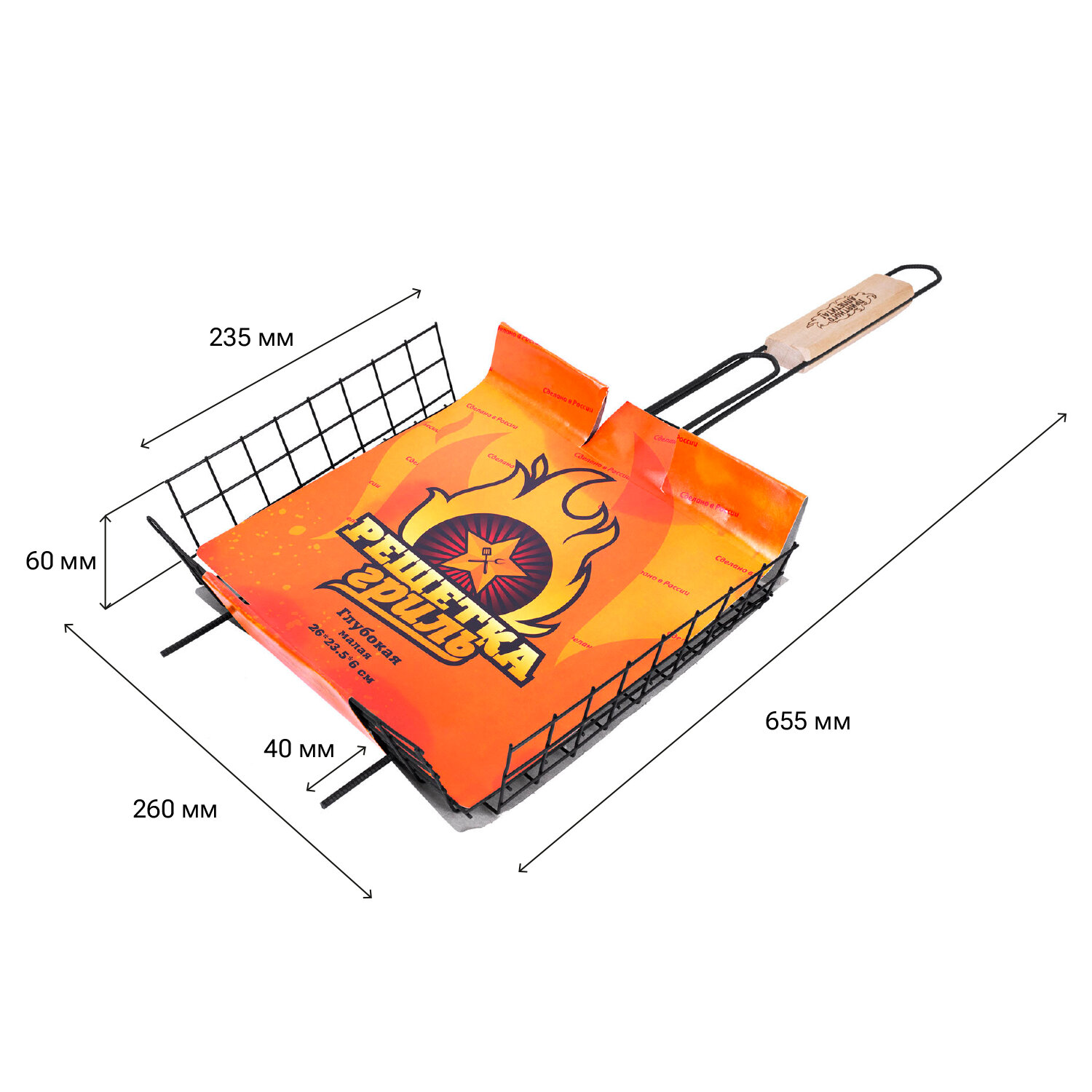 Прутики из прочной стали выдерживают высокие температуры и обеспечивают долгий срок службы. Оксидированное покрытие защищает от коррозии, устойчиво к огню и безопасно для здоровья. Конструкция плотно закрывается и надёжно удерживает продукты при готовке. Деревянная рукоятка не нагревается, удобно ложится в руку и защищает от ожогов. Решетка-гриль ГЛУБОКАЯ универсальная, размер 260х235 мм, глубина 60 мм, оксидированное покрытие, 101405, 701744