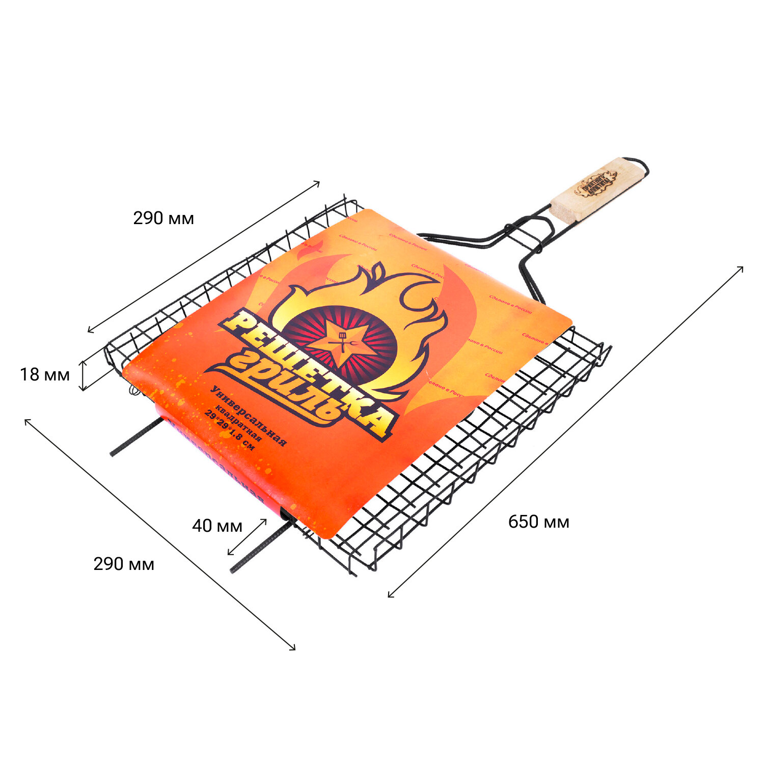 Прутики из прочной стали выдерживают высокие температуры и обеспечивают долгий срок службы. Оксидированное покрытие защищает от коррозии, устойчиво к огню и безопасно для здоровья. Конструкция плотно закрывается и надёжно удерживает продукты при готовке. Деревянная рукоятка не нагревается, удобно ложится в руку и защищает от ожогов. Решетка-гриль универсальная, размер 290х290 мм, глубина 18 мм, оксидированное покрытие, 101418, 701740