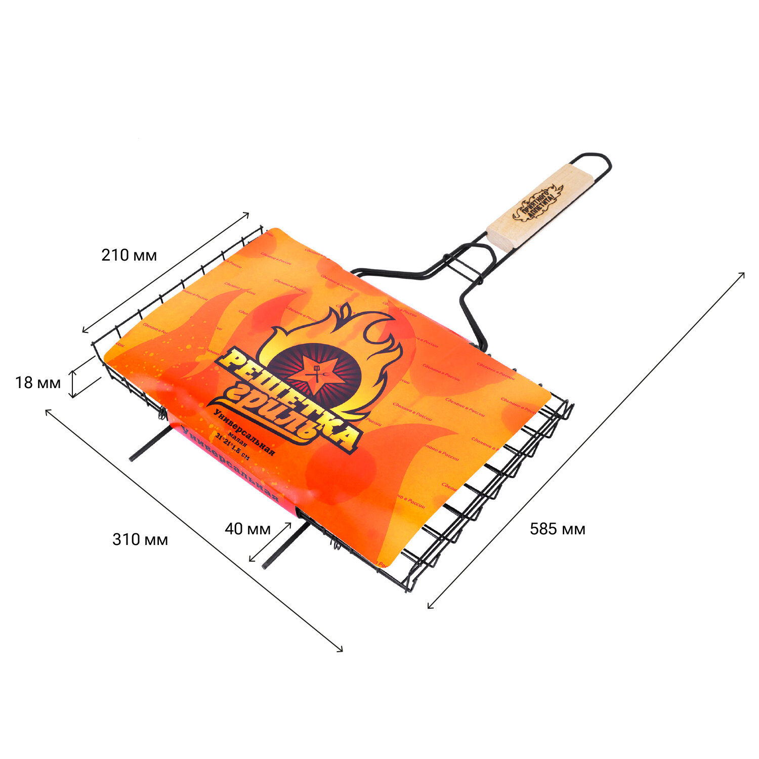 Прутики из прочной стали выдерживают высокие температуры и обеспечивают долгий срок службы. Оксидированное покрытие защищает от коррозии, устойчиво к огню и безопасно для здоровья. Конструкция плотно закрывается и надёжно удерживает продукты при готовке. Деревянная рукоятка не нагревается, удобно ложится в руку и защищает от ожогов. Решетка-гриль универсальная, размер 310х210 мм, глубина 18 мм, оксидированное покрытие, 101402, 701741