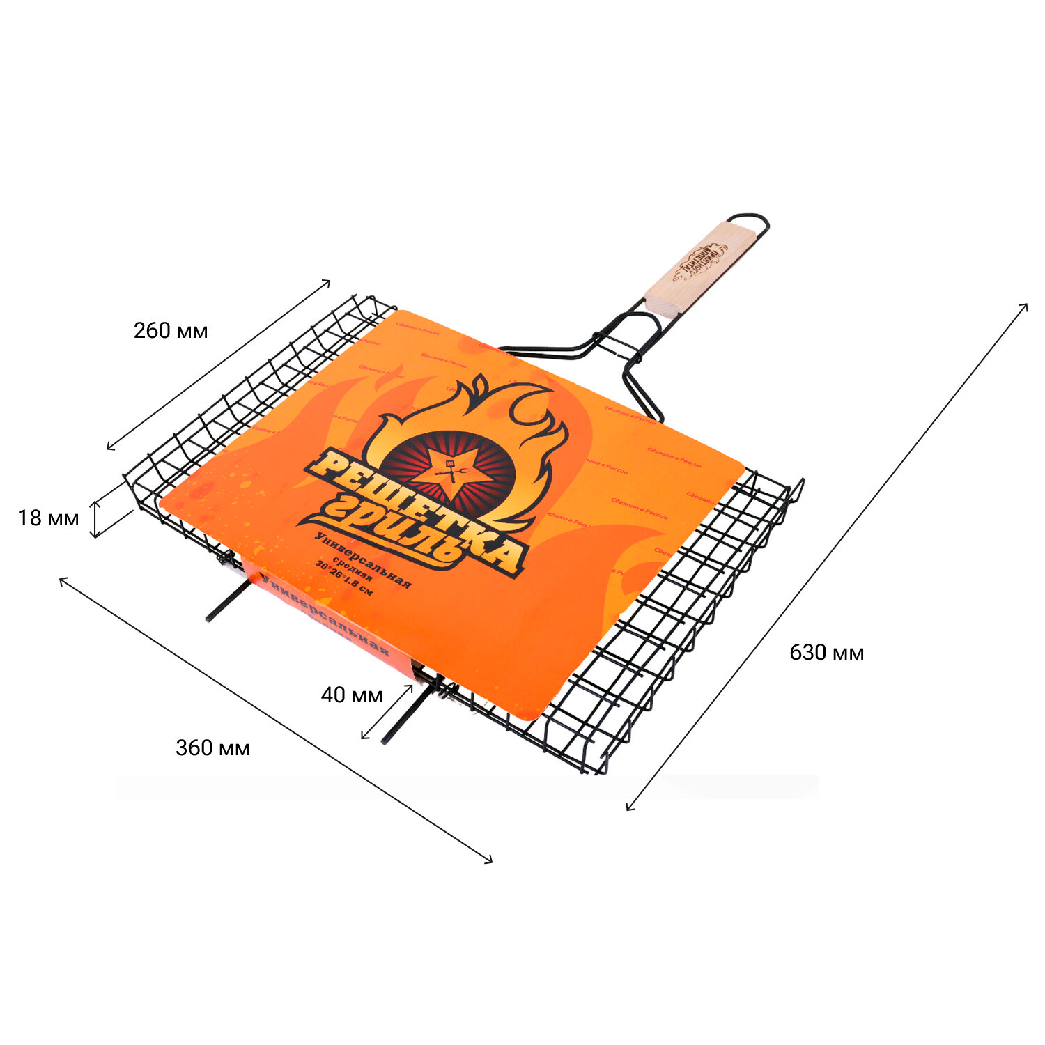 Прутики из прочной стали выдерживают высокие температуры и обеспечивают долгий срок службы. Оксидированное покрытие защищает от коррозии, устойчиво к огню и безопасно для здоровья. Конструкция плотно закрывается и надёжно удерживает продукты при готовке. Деревянная рукоятка не нагревается, удобно ложится в руку и защищает от ожогов. Решетка-гриль универсальная, размер 360х260 мм, глубина 18 мм, оксидированное покрытие, 101403, 701742