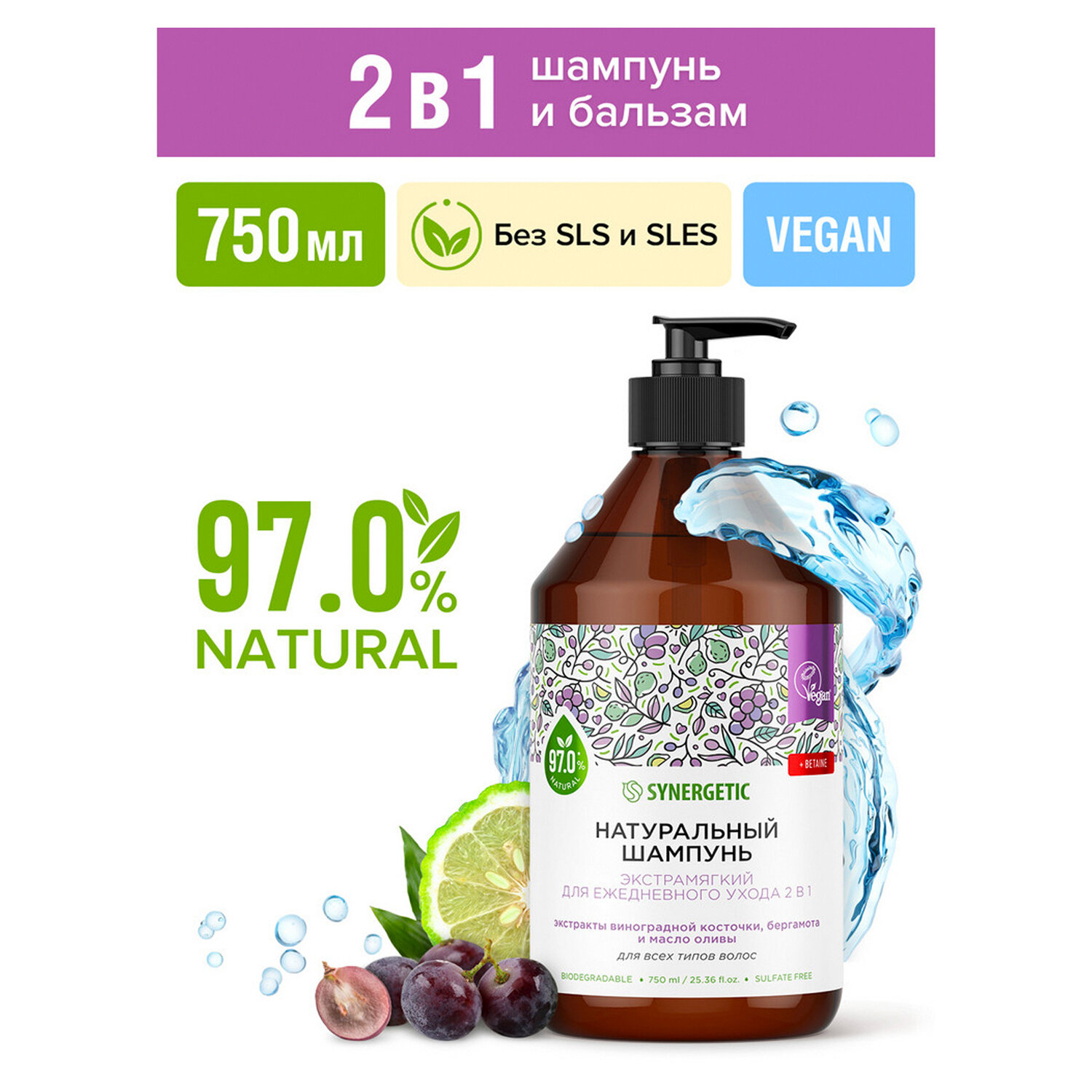 - Шампунь 750 мл, SYNERGETIC "Для ежедневного ухода 2 в 1", бессульфатный, 701753